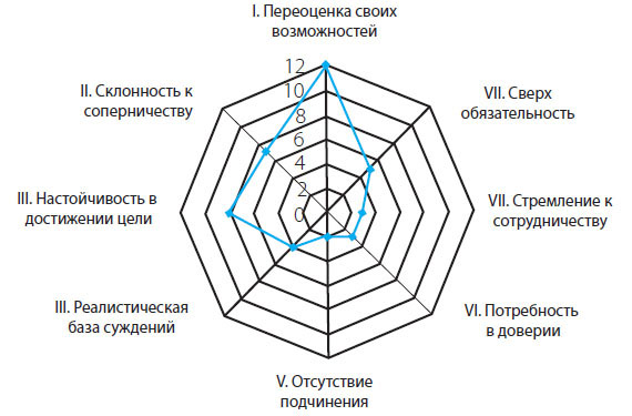 Рис. 5. Профиль личности наставника сборной мужской команды страны, заслуженного тренера В.С. Максимова. Показатель октанта І (авторитарность) - 12 баллов указывает на явную переоценку своих возможностей на грани деспотизма. Он растерял все преимущества национальной мужской команды России и начал вмешиваться в работу женской. По показателю октанта ІІ (эгоистичность) в 7 баллов у него есть склонность к соперничеству. Он упрям, настойчив в достижении цели с выраженностью октанта ІІІ (агрессия) в 8 баллов. Ему присуща реалистическая база суждений - октанта ІV (критичность) 4 балла. Ему вообще чужда подчиненность - 2 балла в октанте V. При этом он испытывает потребность в доверии и полностью независим от чужого мнения - октанта VІ (зависимость) 3 балла. По октанту VІІ (дружелюбие) стремление к сотрудничеству у него составляет всего 3 балла. Вот иллюстрации к проявлению этого качества. После очередного провала в соревнованиях мужской национальной команды России под его руководством он поочередно назначал двух уважаемых специалистов вместо себя на место тренера сборной, а потом снова сам переназначал себя ведущим тренером. Даже при наличии официального трене ра, свидетельствует "СпортЭкспресс" от 13 октября 2010 года, "игрой команды со скамейки руководит один и тот же человек - Максимов. Налицо едино началие. Полное, жесточайшее и авторитарное". А вот по показателю октанта VІІІ (альтруизм) - 5 баллов у него обнаруживаются зачатки мягкосердечности и обязательности по отношению к людям. Выводы. Анализ профилей личности выдающихся тренеров России по гандболу показал присущие всем специалистам и активные и реактивные качества с разной степенью выраженности. По некоторым показателям обнаружено большое расхождение. Выраженность этих качеств имеет тесную связь с профессиональной деятельностью специалистов и отражается не только на состоянии игроков, но и состоянии вида спорта в целом. В связи с простотой диагностики по методике Т. Лири рекомендую тренерам самостоятельно и конфиденциально провести тестирование и посмотреть на себя как бы со стороны. Сначала надо оценить собственные черты характера, соответствующие актуальному "Я", а затем выбрать идеальное "Я", которому хотел бы соответствовать. Наличие расхождения показателей при оценке актуального и идеального "Я" в 4 балла является свидетельством выраженного внутри личностного конфликта, а порой и высокой невротизации человека. Вот здесь-то и необходима работа по самосовершенствованию или помощь психолога. | ||||||||||||||||||||||||||||||||||||||