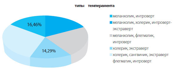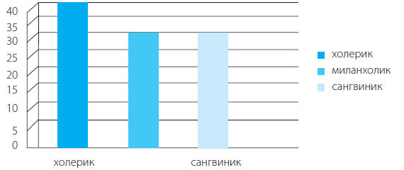 Рис. 1 Круговая диаграмма соотношения типов темперамента спортсменок высокой квалификации в групповых упражнениях художественной гимнастики Каждая деятельность, в зависимости от своих специфических особенностей, предъявляет к психике спортсменок и ее динамическим особенностям определенные требования (Б. А. Вяткин, 1974). В проведенных ранее аналогичных исследованиях в индивидуальных упражнениях было выявлено, что большинство гимнасток высокой квалификации (n = 25) холерики - 40%, меланхолический тип темперамента имеют 30% и сангвиническим типом обладают 30% спортсменок (рис. 2).