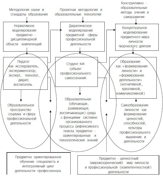 Введение. Современная методология науки и проектная методология образовательных программ рассматривают предмет обучения в высшей школе как информационно-образовательнодеятельностное пространство, основанное на методах и средствах концептуального моделирования внутреннего предметного мира личности студентов [1, 2]. Здесь - в социокультурном образовательном пространстве с функциями обучающей (развивающей) среды - преподаватель вуза выступает как координатор мировоззренческих, научно-познавательных и технологических процессов, интерпретатор всех научно-технических, специальных и педагогических знаний, обеспечивающих профессиональную идентификацию студентов. Приоритетное значение имеет гуманистически ориентированное мировоззрение будущих педагогов, которое включает в себя определённый слой духовно-ценностных феноменов, которые воплощаются в личности, компетенциях и деятельности профессионала [1, 3]. В педагогических технологиях существуют два основных пути образования и развития. Первый - сформировать общепринятый (нормативный) стандарт знаний, умений, навыков. Для этого необходимо формализовать логику научно-поисковой деятельности, определяющую предмет и поисковые действия студента в "нормативной сфере" образования. Второй путь связан с поиском ответов на такие вопросы (проблемы) технологии самообразования и развития личности, которые принципиально не имеют единственного решения. Цель и задачи работы. Известно, что вузовские образовательно-развивающие технологии должны совершенствовать социокультурную природу человека, а не подчинять её себе "катехизисными методами" обучения. Цель и основные задачи статьи - на теоретико-методологическом уровне с учётом современных концептуальных идей - обсудить "педагогический компендиум" профессиональной деятельности педагога вуза и студента в системе образовательно-обучающих-развивающих технологий. Данная сфера представляет собой "концептуально свёрнутую" (обобщённую и систематизированную область специальных знаний), технологически освоенную систему управления профессиональнопедагогической деятельностью человека (методы knowledge engineering, learning-by-going, productive learning). Педагогический компендиум образует принципиально незамкнутую ("открытую") систему инноваций, способную расширять (диверсифицировать) сферу сознания и деятельности как педагога, так и студента. Результаты исследования и их обсуждение. Важными факторами являются разрабатываемая нами проектная методология и антропные образовательные технологии, в которых структура обучающей деятельности конструируется в соответствии с деятельностной (procedural) природой знаний и рефлексивно-личностной культурой мышления профессионала. Принципиально важным было отойти от интеллектуалистской трактовки сознания как суммы "безличных знаний" о мире - без учёта отношения человека к миру в зависимости от его места и функций в профессионально-педагогическом обществе. Современные педагогические технологии должны отражать "метаиндивидное существование" человека - "отражённость" его в другой личности, "семантический диалог" двух и более суверенных субъектов образования. Здесь осуществляется переход от предметно-физической среды к построению экологического - межличностного и аутоличностного - пространства социума и сф