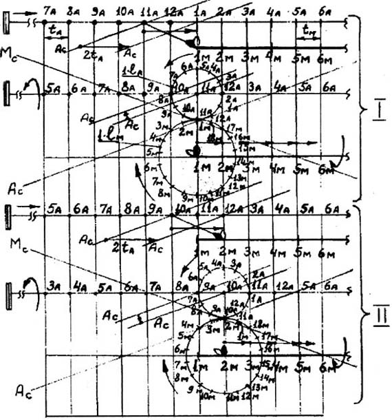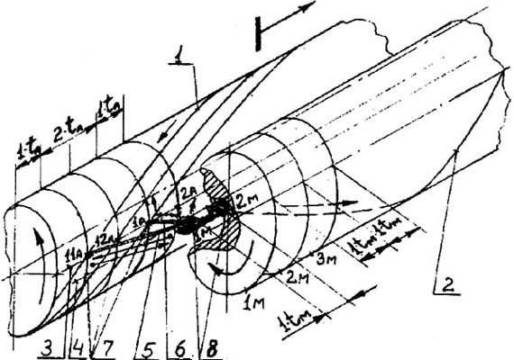 Рис. 2.1 - спираль нити актина, одна из двух, 2 - спираль головча-того конца, одна из шести, миофнламента миозина, 3 - линия фазы взаимодействия, одна из трех, нити актина, 4 - линия фазы взаимодействия, одна из шести, мнофиламента миозина, 5 - мостик № 1(lм) с головкой № 1 молекулы миозина 1м, 6 - мостик № 2(lм) с головкой № 2 молекулы миозина 1м, 7 -11А, 12А, 1А, 2А - глобулы актина, 8 -молекулы миозина 1м, 2м... Принимаем следующие условия по разработанной автором кинематической теории сокращения саркомера: 1. Миофиламент миозина является ведущим, поскольку он имеет мостики № 1м и № 2м и стоит на месте, а миофиламент актина - ведомым, поскольку он перемещается этими мостиками. 2. Тянущий мостик № 1м перемещает нить актина на 2·tА. 3. Скручивающий мостик № 2м разворачивает спирали нити актина и миофиламента миозина на дужки - U 1·1А и + и U 1·l м, что соответствует шажкам -1·tА и + 1·tм. 4. Направление вращения на скручивание для нити актина с левой стороны саркомера принято против часовой стрелки. 5. Направление вращения на скручивание для головчатого конца миофиламента миозина с левой стороны саркомера принято по часовой стрелке. 6. Спирали обоих миофиламентов в левой стороне саркомера имеют левое направление, а в правой стороне - правое направление. 7. Спирали обоих миофиламентов при проектировании их на любую плоскость пересекаются, а в пространстве перекрещиваются. 8. Точка перекрещивания является фазой взаимодействия обоих миофиламентов при наложении одной спирали на другую во время перемещения нити актина мостиком № 1м. 9. Каждая из трех фаз, расположенных вокруг нити актина под углом 120° относительно друг друга при скручивании головчатых концов миозина, перемещается вдоль этого конца по своей линии, названной автором линией взаимодействия. А поскольку фаз три, то и линий взаимодействия будет три. 10. Миофиламенты миозина в пространстве саркомера смещены относительно друг друга вдоль своих осей на 2·tА 11. Взаимодействие глобул и молекул миозина происходит при условии нахождения молекулы миозина на линии фазы взаимодействия, а глобулы актина - или на линии фазы взаимодействия или в самой фазе. Таких фаз три. Автор рассматривает одну из них. 12. Шаг спирали миофиламента актина разбит на 12 шажков, каждый из которых равен tА. 13. Шаг спирали миофиламента миозина разбит на 18 шажков, каждый из которых равен tм. 14. Шажки по оси спиралей миофиламентов актина и миозина равны между собой, т.е. 1м=1А. 15. Участки шажков в нити актина расположены от z-пластинки в сторону середины саркомера, в нашем случае - вправо. 16. Участки шажков на головча-том конце миофиламента миозина расположены в сторону середины саркомера, в нашем случае - вправо. 17. Окружность