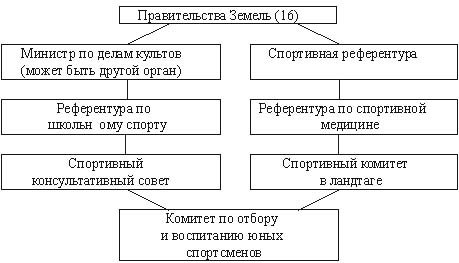 Комитета Государственной думы Ключевые слова: физическое воспитание, спорт, местные органы власти, организационная структура управления спортом, Земля, финансирование спорта, спортивные сооружения, бюджет, коммуна. Сегодня в отличие от 60-80-х годов огромную роль в развитии физического воспитания и спорта в ведущих спортивных державах мира начали играть местные органы власти. Это относится ко всем территориальным органам управления в разных странах: провинциям, графствам, штатам, округам, землям, воеводствам, гминам, муниципалитетам, коммунам и общинам. Причем речь идет обо всех сферах физкультурно-оздоровительной и спортивной деятельности, начиная с физического воспитания в школах, спорта для всех и спорта высших достижений и кончая профессиональным спортом. Однако во многих странах это участие осуществляется по-разному. В связи с тем что российская система организации и управления физкультурно-спортивным движением перешла к территориальному принципу, зарубежный опыт в этой области, несомненно, для нас полезен и интересен. Особый же интерес представляет опыт Германии и Франции. Германия. В соответствии с Конституцией (ст. 30) и федеративной структурой Германии содействие спорту в стране является прерогативой Земель. В настоящее время (после объединения с ГДР) их 16, в том числе 5 новых Земель в бывшей ГДР. Отметим, что в четырех Землях (Бранденбург, Северная Рейн-Вестфалия, Саксония и Тюрингия) занятия спортом гарантируются конституциями Земель, а в пяти - приняты законы "О поддержке спорта". Организационная структура управления спортом в Землях представлена на схеме: