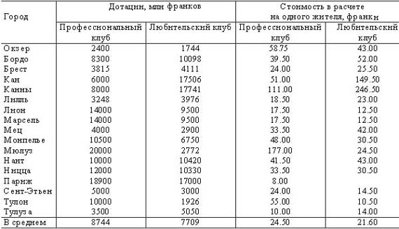 Как видно из табл. 1, в бюджетах провинций доля расходов на спорт колеблется от 1,65 до 6,93%, в то время как бюджет Министерства спорта составляет всего 0,18% от общего госбюджета. Общая сумма ежегодных затрат местных органов власти на спортивно-оздоровительную деятельность в своих областях, городах, регионах и коммунах составляет примерно 22-25 млрд. франков. Помимо прямых финансовых дотаций государство оказывает местным спортивным организациям и спортсооружениям косвенную помощь в виде освобождения от налогов зрелищных мероприятий, предоставления им права на бесплатную установку буфетов и рекламы на стадионах, а также в виде выделения различных займов. В городах с населением свыше 50 тыс. жителей действуют муниципальные спортивно-оздоровительные центры. В настоящее время их около 400. Большое значение в развитии спорта во Франции имеют коммуны. Как правило, подавляющее большинство из них расходует на нужды спорта 5% коммунального бюджета. В 1995 г. Национальный центр по территориальному общественному функционированию провел анкетирование членов около 400 французских коммун с населением более 5000 жителей. Согласно данным этого опроса большинство коммун отдает предпочтение развитию спорта для всех, уделяя основное внимание содержанию спортивных сооружений, вопросам спортивной политики для молодых (школа, колледж, университет) и оздоровительной профилактике. Отмечая резкое возрастание спортивных бюджетов коммун, специалисты подчеркивают, что это происходит в основном из-за увеличения зарплаты и штатов спортивных организаций, клубов. Наблюдается также уменьшение количества добровольцев, работающих в спорте без вознаграждения. И это считается тревожным симптомом. Что же касается непосредственно проведения спортивной политики в коммунах, департаментах и регионах, то ее можно определить следующим образом. Коммуны занимаются развитием спорта в школах, спортивно-оздоровительных клубах/центрах и неорганизованным спортом среди населения, строительством и содержанием спортсооружений, организацией спортивных мероприятий. Департаменты координируют спортивное движение, ибо в его структуре уже есть различные комитеты и федерации, которые занимаются организацией как спорта для всех, так и спорта высших достижений, включая профессиональный спорт, и, конечно, строительством спортсооружений. Регионы выполняют те же функции, что и департаменты, но на региональном уровне. От размера коммуны зависит и наличие в ней службы спорта. Проведенное в 1990 г. анкетирование показало, что 89% общин, население которых превышает 5000 жителей, имеют спортивные службы. Согласно расчету, проведенному Национальной федерацией муниципальных спортивных служб, на одного человека, работающего в службе спорта, приходится примерно 1000 жителей. О том, какое место занимают субсидии центральных и местных органов, нагляднее всего свидетельствует деятельность спортклубов. Следует отметить, что в целом размеры дотаций профессиональному футболу превышают дотации, получаемые от муниципалитетов всеми остальными видами любительского спорта (табл. 2). Таблица 2
