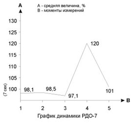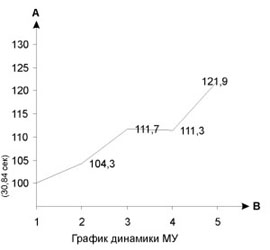 Полученные результаты исследования позволили выявить следующее. Показатели РВ-7 и РДО-7 не достигли достоверных изменений по отношению к фону. Показатели МУ и ДУ-50 достоверно изменились по отношению к фону в моменты перед стартом, после дистанции 100 м и после дистанций 100 и 400 м. Характер изменения МУ: последовательное увеличение от фона к каждому из моментов. Характер изменения в ДУ-50: увеличение от фона до момента после дистанции 100 м и затем последовательное снижение. В показателях РВ-7 и РДО-7 - разная относительная точность перед стартом, после дистанций 100 и 400 м. В показателях после дистанции 400 м наблюдается снижение точности в сторону превышения времени. То же отмечается в показателе РВ-7 в момент перед разминкой. Показатели РВ-7 в большей степени направлены в сторону превышения времени, а показатели РДО-7 - ранней остановки стрелки. Исследования результатов в процентном соотношении выявили следующее: в показателе РВ-7 перед разминкой и после преодоления дистанции 400 м отмечается два всплеска в сторону превышения времени. Динамическая линия характеризуется существенными изломами. В показателе РДО-7 наблюдается более ровная линия с одним всплеском в сторону превышения времени в момент после преодоления дистанции 400 м. В показателе МУ динамическая линия характеризуется поступательным повышением, величина усилий последовательно снижается. В показателе ДУ-50 следует отметить еще одну особенность. Исключая момент после преодоления дистанции 1500 м, во всех остальных случаях наблюдается превышение усилий по отношению к 1/2 от максимального: перед разминкой на 11,1%, перед стартом на 19,6%; после преодоления дистанции 100 м на 21%, а дистанции 400 м на 16,2%. В момент после преодоления дистанции 1500 м величина дозированного усилия уменьшилась на 9,6%.