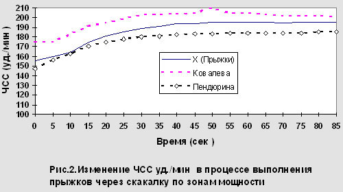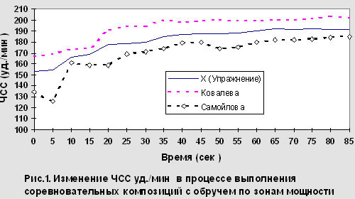 доцент Е.А. Земсков Российская государственная академия физической культуры, Москва Ключевые слова: пульсовой режим, сложнокоординационные упражнения, динамика ЧСС, ошибка исполнения, взаимосвязь, соревновательная и специфическая нагрузки. Качество выполнения сложнокоординационных упражнений повышенной трудности в составе соревновательных композиций - один из основных факторов, определяющих спортивный результат в художественной имнастике [15]. Многочисленные исследования, проведенные в области художественной имнастики, свидетельствуют о том, что на спортивный результат оказывают определенное влияние трудность и оригинальность упражнений, техническая оснащенность композиций, исполнительское мастерство и уровень предметной подготовленности гимнасток [1, 3, 5, 6, 13, 17]. Указанные параметры технической подготовленности характеризу ют специфику тренировочной и соревновательной деятельности, эффективность которой определяется показателями объема и интенсивности направленных тренировочных нагрузок [11, 18], и связанным с ними приростом физических качеств [8, 10, 12], в частности специальной выносливости гимнасток [7, 9]. В настоящее время многочисленными исследованиями доказано, что в основе повышения спортивной работоспособности лежат внутренние процессы адаптации организма спортсмена к различным физическим нагрузкам в процессе тренировки [2, 13]. Специфика адаптационных реакций организма гимнасток при выполнении соревновательных композиций, длительность которых согласно правилам соревнований не превышает 90 с, характеризуется большой и максимальной мощностью (интенсивностью), когда частота сердечных сокращенийЧСС очень быстро нарастает и достигает околопредельной, а в ряде случаев и предельных величин [9]. Поэтому сложнокоординационные упражнения в композиции выполняются на фоне интенсивных биоэнергетических и психофизиологических процессов и связанного с ними высокого уровня порога анаэробного обмена и ЧСС. В изученной нами научной литературе мы не обнаружили исследований , в которых анализировалось бы качество выполнения упражнения на фоне текущих изменений адаптационных процессов, связанных с различными режимами мышечной деятельности гимнасток. В связи с вышеизложенным задачами настоящего исследования являлись изучение характера изменения ЧСС в процессе выполнения собственно соревновательных и специфических тренировочных нагрузок и определение взаимосвязи качества выполнения упражнений с текущими изменениями ЧСС. По условиям проведения лабораторного эксперимента в естественных тренировочных условиях 5 гимнасток, выступающих по программе кандидатов в мастера спорта, выполняли две физические нагрузки: произвольную композицию с обручем (соревновательная нагрузка) и прыжки через скакалку (специфическая нагрузка), продолжительностью 90 с каждая. До и после нагрузок гимнастки выполняли 10 поворотов в аттитюде на 720° в заданном темпе. Экспертами оценивалась техника их исполнения (производились сбавки от 0,1 до 0,6 десятых балла в зависимости от качества выполнения элементов). С помощью спорттестера "POLAR Accurex PLUS" через каждые 5 с регистрировалась текущая ЧСС. В ходе эксперимента было зарегистрировано 10 пульсограмм и 200 экспертных средних оценок качества выполнения поворотов. Результаты исследований 
