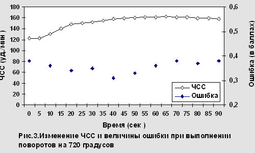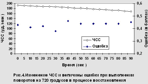 Выполнение поворотов в пульсовом режиме 193 - 175 уд./мин при средней величине пульса 184±1,5 уд./мин характеризуется статистически достоверным (р<0,001) увеличением ошибки до 0,441±0,0011 балла (рис. 4), которая приближается к максимально возможной ошибке 0,6 балла. В зоне анаэробного обеспечения физической нагрузки между показателями ЧСС и величиной ошибки обнаружена отрицательная зависимость (r = -0,618). Вместе с тем результаты корреляционного анализа (см. таблицу) показывают, что более интенсивная и энергоемкая специфическая прыжковая нагрузка в меньшей степени связана с качеством выполнения поворотов по сравнению с эффектом соревновательной нагрузки. Порядковые коэффициенты корреляции (Rs) соответственно составляли 0,494 при b> 0,950 и 0,704 при b> 0,990. Между средними значениями ЧСС до и после физических нагрузок выявлены статистически значимые различия. Однако качество исполнения поворотов достоверно ухудшается только после выполнения соревновательной композиции. В пользу этого говорят достоверные различия средних значений допущенных ошибок до (0,35±0,019 балла) и после (0,46±0,010 балла) выполнения упражнений с обручем, а также статистически значимые различия между средними величинами ошибок после выполнения упражнений с обручем (0,46±0,010 балла) и прыжков (0,40±0,025 балла). Следует заметить, что между величиной ошибок, допущенных после выполнения соревновательной композиции с обручем, имеется достоверная связь (Rs=0,767) с ошибками, зарегистрированными перед выполнением соревновательного упражнения. Установленный факт имеет прогностическое значение для определения ожидаемого спортивного результата. Выводы: 1. В процессе выполнения соревновательных и специфических тренировочных нагрузок длительностью 90 с динамика ЧСС характеризуется следующими фазами: быстрым нарастанием ЧСС до 160 - 170 уд./мин к 12-20-й с, достижением предельной ЧСС до 190-200 уд./мин к 50-60-й с, устойчивым сохранением предельной ЧСС 195-202 уд./мин в течение оставшихся 30-40 с. 2. Качество исполнения сложнокоординационных упражнений - поворотов на 720° взаимосвязано с текущими показателями ЧСС, если пульсовой режим тренировочной нагрузки характери зуется околопредельной и предельной ЧСС 175-200 уд./мин. На фоне нарастания и устойчивого сохранения ЧСС на уровне 160 уд./мин величина ошибки не связана с ЧСС. 3. После выполнения соревновательной нагрузки связь между величиной ошибки и текущим показателем ЧСС усиливается (Rs=0,704) по сравнению с силой связи этих показателей, выявленных после специфической нагрузки (Rs=0,494). При этом абсолютная величина ошибки достоверно увеличивается только после выполнения соревновательного упражнения.