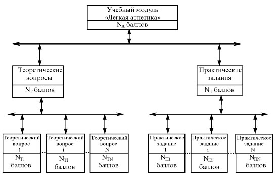 курса физвоспитания с применением Общая структура учебного модуля с рейтинговой системой оценки представлена на рис.3. Суммарный рейтинг NA по модулю "Дисциплина А" определяется по сумме баллов, полученных за подмодули "теоретические вопросы" и "практические задания" (NП баллов). Рейтинг, полученный за эти модули, формируется за счет баллов, полученных при ответах на соответствующие теоретические вопросы (NTi баллов) и выполнении нормативов (NПi баллов). В настоящее время на кафедре физвоспитания ВолГУ ведутся исследования по разработке рейтинговой системы оценки знаний, уровня функционального состояния и физического развития в рамках ПМТО. Использованная итература 1. Многобалльная система оценки двигательной активности студентов и автоматизация учебно-методической работы на ЭВМ. Т.Г. Коваленко, И.В. Шаркевич // Тезисы IV научно-практической конференции "Организация и методика учебного процесса физкультурно-оздоровительной и спортивной работы", Краснодар, 1996, с. 143-144. 2. Чошанов М.А. К вопросу о проблемно-модульном обучении //Среднее специальное образование, 1991, № 7, с. 10-13. 3. Чошанов М.А. Техника проблемного модулирования // Среднее специальное образование, 1991, № 8, 9.