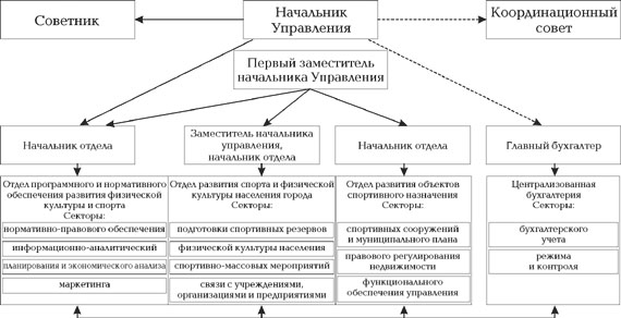 Структура Управления физической культуры и спорта администрации г. Омска В статье 12 Конституции сказано: "В Российской Федерации признается и гарантируется местное самоуправление. Местное самоуправление в пределах своих полномочий самостоятельно. Органы местного самоуправления не входят в систему государственной власти". Это положение не только определяет самостоятельность структуры, но и прежде всего обеспечивает зависимость ее деятельности от потребностей населения той или иной территории. Отсюда изучение потребностей населения в сфере физической культуры и спорта - основополагающий фактор в постановке главной задачи и организации структурного подразделения в системе местного самоуправления, занимающейся этой проблемой. Данное положение основного закона Российской Федерации имеет огромное социально-эко номическое значение для эффективности профессиональной работы управленцев, так как позволяет определить главные статьи расходов местных бюджетов на нужды людей разного возраста, их интересов и потребностей. В главах основного закона есть статьи, расширяющие полномочия местного самоуправления, например, в главе 8 (статья 130) говорится: "Местное самоуправление в Российской Федерации обеспечивает самостоятельное решение населением вопросов местного значения, владение, пользование и распоряжение муниципальной собственностью". В этой же главе 8 , в статье 132 пункт 2, отмечается очень важное положение, касающееся взаимоотношений органа государственной власти и органа местного самоуправления: "Органы местного самоуправления могут наделяться законом отдельными государственными полномочиями с передачей необходимых для их осуществления материальных и финансовых средств. Реализация переданных полномочий подконтрольна государству". В статье 11 Федерального закона "О физической культуре и спорте в Российской Федерации" определяется взаимодействие федерального органа исполнительной власти в области физической культуры и спорта, органов исполнительной власти субъектов Российской Федерации в области физической культуры и спорта, органов местного самоуправления и физкультурно-спортивных объединений. Отмечается, что эти субъекты власти взаимодействуют, координируют, обеспечиваю т помощь и т.п. Совместная деятельность осуществляется на условиях договоров. Отсюда реальной необходимостью являются подготовка и заключение договора о совместной деятельности с разграничением полномочий в области физической культуры и спорта населения между Управлением физической культуры и спорта администрации города (орган местного самоуправления) и Комитетом по физической культуре и спорту администрации области (органы субъекта федерации). В этом случае эффективным будет взаимодействие ветвей власти, исполнение законов и решение важных проблем развития физической культуры и спорта на территории. В статье 2 Федерального закона 1995 г. отмечается: "Местное самоуправление в Российской Федерации признается и гарантируется конституцией Российской Федерации. Самостоятельная деятельность органов местного самоуправления осуществляется на основе решения вопросов местного значения, исходя из интересов населения его исторических и иных местных традиций". На наш взгляд, данное положение Закона ставит перед управлением в