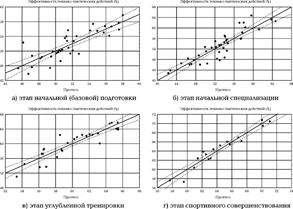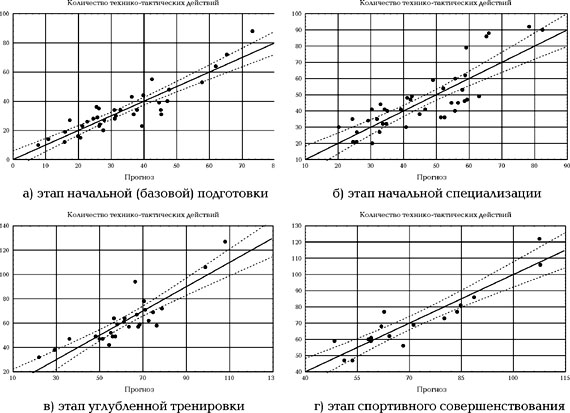 Рис.2. Графическая характеристика полученных регрессионных моделей для активности соревновательной деятельности Независимыми переменными в уравнениях, отражающих взаимосвязь эффективности соревновательной деятельности и подготовленности спортсменок (см. табл. 1, рис. 1), являются следующие показатели и характеристики: - на этапе начальной подготовки: длина тела (Х1); росто-весовой индекс (Х2); мышечная масса (Х3); прыжок в длину с места (Х4); бег 30 м с места (Х5); РДО (Х6); объем внимания (Х7); переключение внимания (Х8); удары по воротам (время) (Х9); - на этапе начальной специализации: длина тела (Х1); росто-весовой индекс (Х2); прыжок в длину (Х3); РДО (Х4); реакция прогнозирования (Х5); дифференцировка мышечных усилий (Х6); кине-стезическая чувствительность (Х7); оперативность мышления (Х8); точность и дальность броска мяча (Х9); - на этапе углубленной тренировки: длина тела (Х1); прыжок в длину с места (Х2); дизъюнктивная реакция (Х3); РДО (Х4); рациональность мышления (Х5); распределение внимания (Х6); реакция прогнозирования (Х7); обводка стоек с передачей (Х8); точность и дальность броска мяча (Х9); техника обводки (Х10); - на этапе спортивного совершенствования: PWC170 (Х1); прыжок в длину с места (Х2); челночный бег (Х3); дифференцировка мышечных усилий (Х4); скорость переработки информации (Х5); рациональность мышления (Х6); распределение внимания (Х7); переключение внимания (Х8); удары по воротам (время) (Х9); техника обводки (Х10). Анализ составов комплексов наиболее информативных показателей дает возможность выделить особенности, характерные для каждой возрастно -квалификационной группы. На этапе начальной спортивной подготовки значительный удельный вес в комплексе наиболее информативных характеристик имеют показатели, отражающие уровень физического развития и физической подготовленности спортсменок. Из показателей, характеризующих психологическую подготовленность спортсменок, наибольшее значение имеют различные свойства внимания. На этапе начальной специализации наряду с сохранением значимости показателей физического развития и физической подготовленности спортсменок происходит повышение числа входящих в модель психофизиологических показателей, являющихся основой и для успешного овладения техническими приемами, и для тактической подготовки спортсменок. Характери зует этот этап и появление в числе наиболее информативных характеристик показателей оперативности мышления и скоростной техники обводки. На этапе углубленной тренировки оперативность мышления уступает место рациональности (естественно, в условиях временного ограничения). Здесь же увеличивается удельный вес показателей технической подготовленности, а также показателей, с различных сторон характеризующих быстроту и точность двигательных реакций спортсменок, что отражает новые требования со стороны игровой соревновательной деятельности, связанные с повышением темпа игры и необходимостью принятия более быстрых и точных решений. На этапе спортивного совершенствования в число наиболее значимых входит показатель физической работоспособности, что связано с повышением требований к этому компоненту подготовленности со стороны соревновательной деятельности. В это же время впервые в числе наиболее информативных характеристик появляется показатель челночного бега, по результатам кото