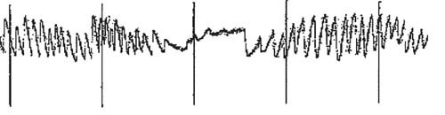 является возникновение неугасающего нистагма с Результаты и обсуждение . В целях повышения полноты и точности исследования, а также для проведения тренировок на улучшение вестибулярной устойчивости нами была разработана принципиально новая "щадящая" методика "самостимуляции", не имеющая аналогов в отечественной и зарубежной практике. Тест выполнялся в автоматическом режиме на основе самостимуляции ампулярных рецепторов с введением обратной связи по скорости медленного компонента нистагма (СМК). Биопотенциалы, снимаемые с помощью электродов, расположенных на наружных углах глаз, увеличиваются усилителем и поступают на блок выделения медленного компонента. Далее сигнал, пропорциональный СМК, подается на вход управляемого электропривода. АДС вместе с обследуемым начинает вращаться пропорционально СМК. По мере уменьшения CМК скорость АДС замедляется, и после короткой остановки стенд начинает вращаться в противоположную сторону от СМК постнистагма. Следствием этого процесса является возникновение неугасающего нистагма "веретен"-полупериодов. Последние могут быть как симметричными, так и несимметричными. Симметричные и короткие веретена продолжительностью до 10 с положительно коррелируют с вестибулярной устойчивостью. Несимметричные или продолжительные, нерегулярные "веретена" длительностью более 15 с свидетельствуют о снижении вестибулярной устойчивости. Типичные нистагмические веретена неугасающего нистагма при "самостимуляции" представлены на рисунке. Вестибулярная устойчивость и нистагм спортсменов до и после тренировки