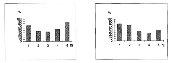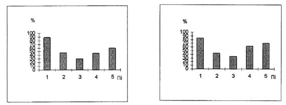 В табл. 2 представлена возрастная динамика мотивации и других показателей деятельности борцов вольного стиля. Прежде всего обращают на себя внимание показатели и их изменения в связи с возрастом, свидетельствующие о валидности подхода. К ним относятся цели занятий спортом, стаж тренировок и квалификация борцов. Все эти показатели в связи с логикой развития вида спорта либо увеличиваются, либо уменьшаются, тем самым показывая, что в сферу анализа мы включили существенные переменные. Вместе с тем о валидности самого метода говорят данные возрастной динамики структуры мотивации борцов. Так, оказалось, что в мотивации спортсменов первых двух возрастных групп доминирует потребность в психофизическом совершенствовании и пацифистские отношения к спорту. Второй факт особенно отраден, поскольку мотивация в спорте, как показали исследования [10, 5, 6, 1 и др.], формируют либо стихийно, либо опираясь на простейшие, лежащие на поверхности потребности (быть сильным, ловким, смелым и т.п.), в то время как, и это показывают данные, приведенные в табл. 2, олимпийский спорт таит в себе огромный потенциал, связанный с изменением общественного сознания россиян по поводу миротворческих возможностей олимпийских игр. Все это свидетельствует о том, что работа авторов [2, 6, 9, 8 и др.], посвятивших себя решению этой проблемы, не пропала даром. Тем более, что у спортсменов 21 года и старше (5-я группа) потребность в установлении мира на Земле через спорт стала доминировать в 42,8 % случаев. Это тем более отрадно, что 85,7 % из них являются МСМК и МС. Не меньший интерес представляет и то, что в возрасте 16-17 лет в мотивации большого числа спортсменов (40,5 %) доминирует потребность карьеры в другой деятельности благодаря успехам в спорте. И это не удивительно, поскольку данный возраст связан с окончанием школы и выбором дальнейшего жизненного пути, поэтому не случайно столь утилитарное отношение к спорту. Кстати эта же тенденция сохраняется и в группе 18-19-летних борцов (24,5 %). И, наконец, наблюдаемая в группе борцов 21-29 лет тенденция к стабилизации на невысоком уровне числа самоутверждающихся в спорте (14,3 %) говорит о многом, и прежде всего о необходимости более глубокого изучения этого непростого для становления МСМК возраста. Теперь обратимся к рассмотрению индивидуальных мотивационных портретов борцов. На рис. 1, а, б представлена динамика мотивации МСМК Д., призера Чемпионата России 1997 г., победителя многих всероссийских и международных турниров. При первом обследовании (16.02.1999 г.) в его мотивации доминировали потребности в установлении мира на Земле (П5) и в самоутверждении (П1). К сожалению, вскоре спортсмен Д. заболел. Серьезные боли в области печени и неутешительный диагноз врачей выбили спортсмена из колеи. Ему не удалось поддерживать высокую тренированность, резко упала стабильность его выступлений на соревнованиях. Наряду с победой на турнире в Турции последовали срывы в Киеве и Красноярске и четвертые места на Чемпионате России 1999 г. и на международном турнире в г. Хасавюрте. Все это привело к серьезным изменениям в мотивационной сфере спортсмена. Обследование, проведенное 29.12.1999 г. (рис. 1, б), показало значительное увеличение фактора материальной потребности (П2) и весьма ощутимое снижение пацифистских устремлений (П5), а фактор, связанный с улучшением здоровья, спор