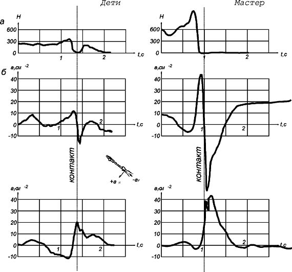 Рис.1. а - тензодинамограмма (ТДГ) опорных реакций; б - акселерограмма ракетки по двум направлениям (поперечное и продольное) Рис. 2 демонстрирует процесс переноса общего центра тяжести (ОЦТ) теннисиста при подготовке к подаче. Кривая 2 а показывает перенос ОЦТ сначала вправо на сзадистоящую ногу для толчка. Затем происходит резкий выброс тела вперед и создается вращательный импульс момента силы реакции опоры, который порождает механическую волну, передающуюся от опоры ко всем вышерасположенным звеньям. Мастер в фазе контакта не стоит на платформе, а ребенок по каким-то причинам продолжает в процессе соударения подталкивать тело в направлении будущего удара, т.е. ребенком удар выполняется при уменьшенной вращательной нагрузке на ноги, но все-таки в некотором взаимодействии с опорой (рис. 2 б). Итак, вывод по материалам анализа рис. 2: мастер действительно все подачи выполняет вне опоры, что подтвердили записи сил и их моментов на опоре. Ребенок в период контакта не всегда выходит в безопорное положение, продолжая корректировать позу на опоре преимущественно в направлении удара, т.е. вокруг фронтальной оси (вперед-назад) и в меньшей мере - вправо-влево (cм. рис. 2 б). Можно предположить, что работа ног на опоре необходима начинающему теннисисту для согласования движений тела и мяча в случае недостаточной пространственной и временной координации движений. Обсуждение преимущества безопорного удара. 1. Более благоприятные условия мышечной энергетики. Мышцы ног после отталкивания от опоры и выхода в безопорное состояние расслабляются и не мешают ускоренному сгибательному движению туловища в направлении удара. 2. Проще информационная картина управления. Рецепторы стопы и ног освобождены от снятия информации и отслеживания реакции опоры, изменение которой в процессе отталкивания показано выше (см. рис. 1). 3. Короткий, сильный доударный толчок упругими ногами вперед-вверх задает центру масс тела добавочную скорость, влияющую на скорость ракетки, которая к моменту контакта с мячом у ведущих теннисистов мира равна 50 м/с, а у волейболистов в безопорном ударе после шага и прыжка скорость центра кисти руки - 38 м/с. 4. Двигательная программа безопорного удара проще, вследствие чего и более высока точность безопорных ударных движений, что доказано нашими наблюдениями и работами других авторов [1 и др.]. Простота программы объясняется определенностью величины присоединенной ударной массы (при снятии ног с опоры), что отражается на стабильности скорости вылета мяча. Вращение тела в безопорном положении происходит вокруг центра масс тела, т.е. по короткой кинематической цепи. В то же время удары на опоре совершаются длинной многозвенной открытой цепью звеньев, подверженной сбивающим воздействиям силы реакции опоры. Последние 88 мс перед соударением недоступны для текущей коррекции программы [2], а потому важными факторами надежности игры выступают определенность вклада массы при безопорном ударе, стабильность динамики и возможность с большой надежностью бить по мячу по заранее составленной двигательной программе удара.
