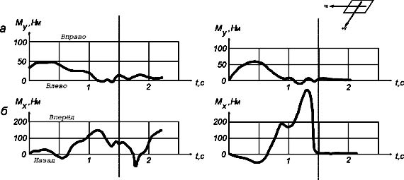 Рис.2. Стабилограмма моментов сил: поперечной (а) и продольной (б) осей телапри движении на опоре. Итак, если нами изложены разные программы действий при опорном и безопорном ударах, разный механизм их реализации, то разным должно быть и обучение технике. Однако до настоящего момента авторы пособий по обучению ударам по мячу не только в теннисе, но и в других видах игр не акцентируют внимания на методике обучения безопорному удару, тем более в раннем возрасте. В то же время первые заложенные в детском возрасте координационные механизмы оказываются самыми прочными. Это не требует доказательства. А потому важно рано ставить механизм безопорного удара, если он так актуален в современных играх с мячом. Первые попытки создания научных основ методики обучения безопорному удару были предприняты нами совместно с Е. Квитченко. Этот эксперимент показал, что обучение детей 5-7 лет умению противодействовать силам отдачи при броске и ловле в безопорном положении способствует скорейшему освоению удара. В настоящий момент на основе накопленного опыта составлена и ныне реализуется программа по теннису для детей 5-6-летнего возраста, в которой сделан акцент на методике формирования у начинающих необходимых умений и навыков с целью возможно раннего освоения техники безопорных ударов. Практические рекомендации по методике обучения ударам без опоры: 1. Воздействие на структуру физической подготовленности детей, начинающих играть в мяч, с учетом того, что в этом возрасте нельзя пропустить первый сенситивный период развития скоростно-силовых качеств. С этой целью рекомендуется в большом объеме прыжковая подготовка обычными средствами и с помощью плиометрических упражнений для совершенствования упруго-жестких свойств мышц и формирования быстроты и кратковременности проявления усилия. 2. Формирование