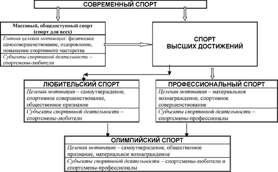 Модель структуры современного спорта Возьмем другой пример. За последние пятнадцать лет мировое достижение в марафонском беге улучшалось несколько раз и только на коммерческих соревнованиях. При этом сами мировые рекордсмены не добивались успехов в крупных официальных стартах (Олимпийских играх, чемпионатах и кубках мира). В настоящее время при проведении коммерческих соревнований и турниров учитываются условия, необходимые для реализации специфических спортивных, экономических и общекультурных функций. При этом организаторам приходится искать компромиссные решения, позволяющие в какой-то мере сгладить противоречия между этими функциями. Интерес зрителей, СМИ, спонсоров, проявляемый к коммерческим и другим соревнованиям, определяется ожидаемым высоким качеством соревновательной деятельности участников. Поэтому организаторы приглашают для участия в них ограниченный круг наиболее сильных и популярных спортсменов или команд и создают условия, способствующие демонстрации высших достижений. Финансовый успех спортсменов и команд на таких соревнованиях обусловлен прежде всего количеством случаев демонстрации высших качественных характеристик соревновательной деятельности. От участников соревнований требуется очень высокий уровень спортивных результатов, позволяющих рекламировать вероятные сенсационные достижения. Снижение качества соревновательной деятельности ниже определенного уровня ведет к завершению успешной коммерческой карьеры спортсмена или команды, так как организаторы соревнований найдут им замену - другого спортсмена или команду, способную демонстрировать требуемый уровень достижений. Таким образом, супердостиженческий и профессионально -коммерческий спорт по уровню достижений сегодня практически не различается и часто спортсмены, отнесенные ко второму направлению, имеют более высокие результаты, чем отнесенные к первому. Поэтому термин "профессионально -супердостиженческий спорт" не вполне логичен. Разработанная с учетом изложенного модель современного спорта может иметь следующую структуру (см. рисунок). О социально-правовом статусе спортсменов -профессионалов . Современный спорт высших достижений не только сложен в структурном отношении, но и далеко не однороден по составу субъектов спортивной деятельности. Большую часть его участников составляют спортсмены-профессионалы, которые проходят сложный многолетний путь от юношеских, юниорских, студенческих коллективов и команд до профессиональных клубов, на этом пути изменяется их социальный и правовой статус. Полноценным спортсменом-профессионалом может считаться тот спортсмен, спортивная деятельность которого регулируется трудовым договором (контрактом), соответствующим трудовому законодательству. Спортсмен-профессионал - указывается в законе "О физической культуре и спорте" - это "спортсмен, для которого занятия спортом являются основным видом деятельности и который получает в соответствии с контрактом заработную плату и иное денежное вознаграждение за подготовку к спортивным соревнованиям и участие в них" [4]. В связи с этим следует иметь в виду, что "Трудовой договор (контракт) есть соглашение между работником и работодателем (физическим либо юридическим лицом), по которому работник обязуется выполнять работу по 