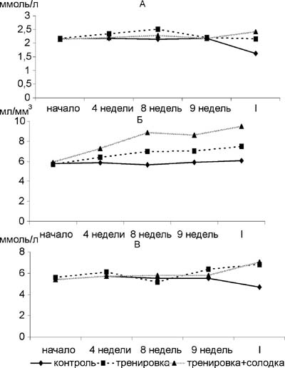 не включались. В том случае, если Результаты исследования. Тренировка животных по предложенной схеме значительно повышала их работоспособность. Употребляемый экстракт корня солодки оказывался дополнительным стимулом в становлении и повышении адаптивных возможностей крыс. Так, если продолжительность бега в группе животных, находящихся на обычном пищевом рационе, возросла на 63,5%, то животных, получавших экстракт корня солодки в дозе 50 мг/кг массы тела, - на 120%. Биохимический анализ крови позволил установить следующую динамику изучаемых показателей. Концентрация общего Са в процессе тренировок повышалась. Степень гиперкальциемии коррелировала с объемом и интенсивностью нагрузок. Наиболее значительное повышение Са было отмечено в период окончания 3-го микроцикла. После 4-го, когда объем нагрузок значительно снижался, понижалась и концентрация общего Са (рис. 1 А). Содержание эритроцитов (рис. 1 Б) в крови в процессе тренировок возрастало, уровень глюкозы (рис. 1 В) снижался в период интенсивных мышечных нагрузок.