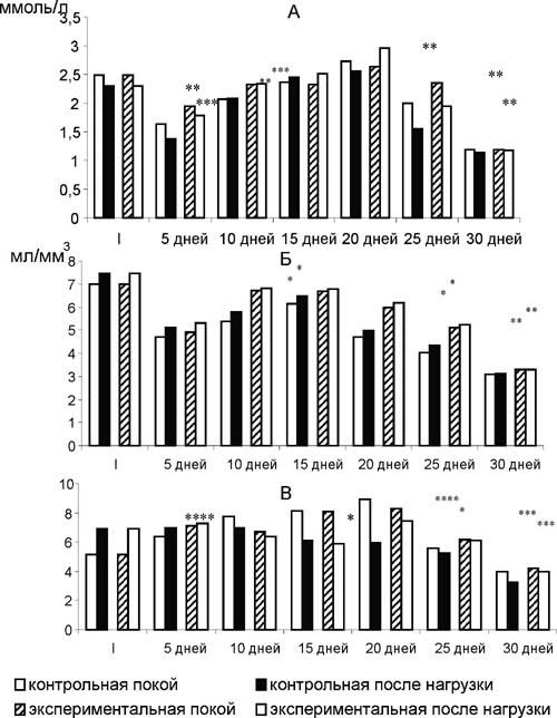 Рис. 2. Влияние дозированной мышечной нагрузки на содержание общего кальция (А), эритроцитов (Б), глюкозы (В) в крови крыс. Примечание: I - исходный уровень. Уровень достоверности отличий по сравнению с контролем: р<0,001 - *, р<0,01 - **, р<0,02 - ***, р<0,05 - ****. В том случае, если параллельно с тренировками осуществлялось введение экстракта солодки, волнообразные изменения концентрации Са и глюкозы были незначительными, а прирост количества эритроцитов - достоверно выше. Учитывая роль Са в протекании физиологических функций в живых системах, а также в секреции катехоламинов и гормонов гипоталамо-гипофизарно-надпочечниковой системы, гиперкальциемию, возникающую как в начале однократной нагрузки, так и при интенсификации тренировочного процесса, следует рассматривать как фактор, способствующий активированию адаптивных процессов и компенсаторных реакций организма. Употребление корня солодки снижало степень напряжения компенсаторных механизмов. Таким образом, употребление экстракта корня солодки значительно облегчает адаптации организма к мышечным нагрузкам. Дополнительным подтверждением может служить концентрация глюкозы. В период интенсивных тренировок она снижалась в крови животных, не принимавших экстракт, что свидетельствует о частичном истощении энергетических запасов в их организме. В 3-й группе колебания концентрации глюкозы были незначительными. Употребление экстракта солодки, по всей видимости, способствовало более экономному расходованию углеводов. Необходимо отметить, что большинство адаптогенов усиливает энергетическое обеспечение работающих органов, стимулируя аэробные окислительные реакции, что, в свою очередь, расширяет круг окислительных субстратов за счет использования липидов. Об усилении мобилизации липидов из жирового депо под влиянием адаптогенов свидетельствует повышение липолитической активности жировой ткани и увеличение в крови их основной транспортной формы - неэстерифицированных жирных кислот. Повышение содержания липидов и их йодного числа в печени свидетельствует об интенсивном использовании жиров работающими тканями [16]. Поступление липидов в печень имеет важное значение в энергетическом обмене, поскольку в этом органе липиды окисляются до легкоутилизируемых веществ, которые при выходе из печени используются мышцами. Кроме того, более значительное увеличение числа эритроцитов в крови животных, употреблявших экстракт корня солодки, являлось дополнительным фактором, расширяющим адаптивные возможности организма. Мы уже отмечали, что начальный этап действия любого стрессирующего фактора характеризуется гиперкальциемией. Поэтому повышение содержания Са в крови следует рассматривать как фактор, способствующий активированию эндокринных механизмов адаптации и создающий благоприятные условия для работающих систем. В отличие от этого гипокальциемия - фактор, ограничивающий эту активность и тем самым предохраняющий организм от чрезмерного расходования энергетических и пластических ресурсов. В соответствии с этим способность к поддержанию кальциевого гомеостаза предложено рассматривать как показатель адаптивных возможностей организма [9, 19]. В наших исследованиях выполнение дозированной нагрузки сопровождалось гипокальциемией для нетренированных животных, тенденцией к сн