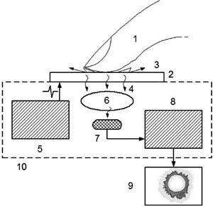 Рис. 1а. Схематическое изображение ГВР прибора. 1 - объект исследования; 2 - прозрачный электрод; 3 - газовый разряд; 4 - оптическое излучение; 5 - генератор; 6 - оптическая система; 7,8 - видеопреобразователь; 9 - компьютер; 10 - корпус Принцип метода ГРВ заключается в следующем рис.1а): между исследуемым объектом (1) и диэлектрической пластиной (2), на которой размещается объект, подаются импульсы напряжения длительностью 10 мкс от генератора электромагнитного поля (5), из-за чего на обратной стороне пластины (2) развивается лавинный и/или скользящий разряд, параметры которого определяются свойствами объекта. Свечение разряда с помощью оптической системы и ПЗС-камеры (6-8) преобразуется в видеосигналы, которые фиксируются в памяти компьютера (9) в виде одиночных кадров биоэлектрограмм (БЭО-грамм). Обработка производится с помощью специализированного программного комплекса, который позволяет вычислять набор параметров БЭО-грамм и на их основе делать определенные диагностические заключения. Аппаратный комплекс "Коррекс", используемый при проведении ГРВ-графии, соответствует требованиям нормативных документов безопасности и разрешен к применению Комитетом по новой медицинской технике МЗ РФ и Госстандартом России с 1999 года, регистрационный номер в государственном реестре медицинских изделий № 29/06111299/3064-02 от 23 января 2002 г. Для характеристики БЭО-грамм используются следующие показатели: площадь газоразрядного изображения, нормализованная площадь, интегральный коэффициент площади, энтропия изображения и коэффициент фрактальности. Исследуются значения этих показателей для каждого пальца руки, средние значения показателей для пальцев обеих рук и отдельно для правой и левой, определяются величины параметров в секторах проекционных зон функциональных систем, предложенных P. Mandel (1986) в модификации К.Г. Короткова [15] (рис.1 б). У практически здоровых людей величины колебаний параметров БЭО-грамм (среднесуточная и средняя 10-минутная) составляют соответственно 6,6 и 4,1%. Сформированный в ходе совместных исследований со специалистами США, Швеции, Финляндии и Словакии банк данных позволил определить зону нормы для вышеуказанных параметров БЭО-грамм, характерных для практически здоровых людей разных возрастных групп и пола [16]. Апробация технологии ГРВ-биоэлектрографии в спорте была проведена в 1999 - 2002 гг. на базе Северо-Западной Олимпийской Академии России (президент - академик В.У. Агеевец) в совместных исследованиях СПбНИИФК и Академии физической культуры им. П.Ф. Лесгафта. В исследованиях приняли участие чемпионы Олимпийских игр и высококвалифицированные спортсмены училищ олимпийского резерва № 1, 2 и Центра олимпийской подготовки Санкт-Петербурга (средний возраст - 18,3±3,5 года), среди них 15 мастеров спорта международного класса, 26 мастеров спорта и 42 кандидата в мастера спорта. Всего в комплексных лонгитюдных исследованиях было проведено более 348 человеко-обследований. По данным углубленных медицинских обследований, все спортсмены были практически здоровы и активно выступали на международных соревнованиях и в сборных России и города в видах спорта, где тренировка на выносливость является доминирующей: в современном пятиборье, триатлоне, лыжных гонках, конькобежном спорте, академической гребле и плавании.