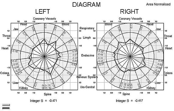 Рис 1б. ГРВ-диаграмма практически здорового человека. Сектора диаграммы соответствуют проекцион ным зонам функциональных систем организма. Левая и правая диаграммы построены по параметру JS пальцев левой и правой руки. Две кривые соответствуют состояниям человека в разные дни одной недели