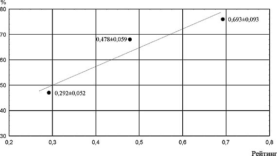 Рис. 3. Взаимосвязь рейтинга высококвалифи цированных спортсменов по психофизическому потенциалу с относительным количеством спортсменов, находящихся в благоприятных триместрах индивидуального года. Рейтинг определялся по программе GDV APPS (см. текст), группы включают по 25 спортсменов, межгрупповые различия достоверны по критерию Манна-Уитни