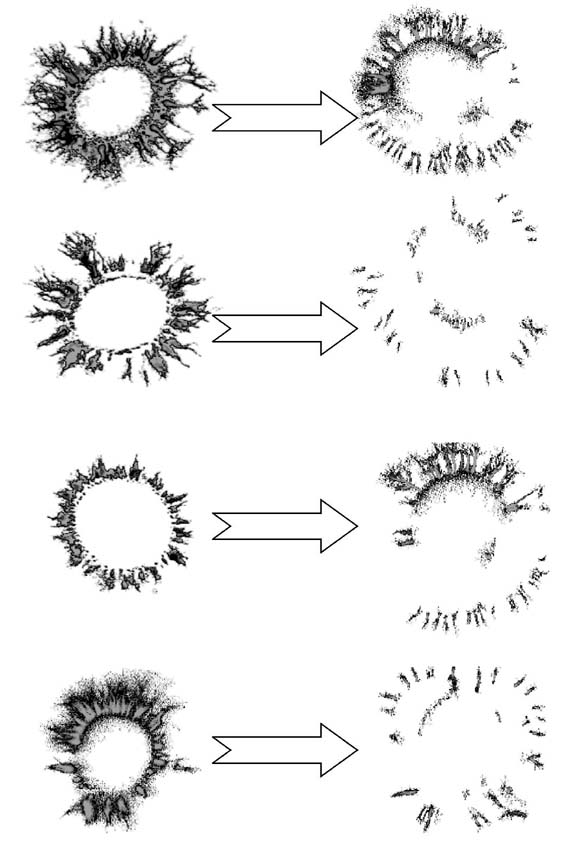 Рис. 4. Пример трансформации параметров БЭО-грамм высококвалифицированных спортсменов, прошедших курс ментальной подготовки, в условиях имитационного моделирования стартового состояния. Слева БЭО-граммы в состоянии покоя, справа - в условиях идеомоторного моделирова ния стартового состояния Таким образом, параметры БЭО-грамм высококвалифицированных спортсменов, регистрируемые в состоянии относительного покоя, важны для объективизации психоэнергетических функциональных резервов спортсменов, характеризующих их психофизический потенциал 1. При этом крайне важно подчеркнуть, что если с учетом хронобиологии [4, 11, 22] оценить психофизический потенциал спортсменов на момент проведения обследований, то обнаруживается другая закономерность - связь параметров БЭО-грамм с периодами их индивидуального года. Проверка данной закономерности на большом контингенте юных высококвалифицированных спортсменов показала, что те из них, кто находится в так называемых благоприятных периодах индивидуального года, отличаются, по данным ГРВ-биоэлектрографии, наиболее высоким уровнем психоэнергетических функциональных резервов (рис. 3). С учетом вышеизложенного, а также специфики современных стратегий подготовки спортсменов [3] есть все основания полагать, что параметры БЭО-грамм, отражающие как "консервативные" (генетические), так и "лабильные" признаки (актуальное функциональное состояние спортсмена на данный момент), можно использовать в качестве маркеров долгосрочного и краткосрочного прогнозов готовности спортсменов к соревнованиям. Последнее тем более правомерно, что использование в исследованиях функциональной нагрузки в виде имитационного моделирования условий соревновательной деятельности ("вызванное стартовое состояние") свидетельствует о том, что высококвалифицированные спортсмены, отличающиеся оптимальной психофизической готовностью по данным психологического и психофизиологического обследований, обладают способностью к экстренной идеомоторной модуляции паттернов БЭО-грамм. Выявленный феномен выражается в усилении фрагментации БЭО-грамм и образовании в ряде случаев мощных выбросов дистантной эмиссии (рис. 4). Исследования, проведенные совместно со специалистами Скандинавского международного университета (Швеция) и Университета Куопио (Финляндия) [21], дают основания считать, что специфическим условием формирования дистантной эмиссии является способность спортсмена к произвольному экстренному и краткосрочному погружению в так называемое альтернативное состояние сознания (АСС) [5]. При этом необходимо отметить, что из практики олимпийского спорта известно: пик спортивного достижения во многих видах спорта связан именно со способностью спортсмена к краткосрочному погружению в АСС [9, 10, 21].