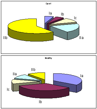 Рис. 2а. Типизация БЭО-грамм у группы практически здоровых обследованных (слева) и высококва лифицированных спортсменов, тренирующихся в виде спорта на выносливость (справа). Выборки аналогичны по числу обследованных (65 человек), соотношению лиц женского и мужского пола (45-55%) и возрасту (18,1 ± 2,3 года)
