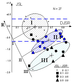 Рис. 2б. Результаты кластерного анализа для группы высококвалифицированных спортсменов УОР-2 С.-Петербурга (директор - И.И. Комаров). По осям отложены ГРВ параметр JSL для левой руки и дисперсия этого параметра DJSR для правой руки. Ось R представляет рейтинг спортсменов по результатам годового соревновательного цикла. Видно, что разделение спортсменов на группы по величине ГРВ параметров коррелирует с эффективностью соревнова тельной деятельности Полученные результаты свидетельствуют, что высококвалифицированные спортсмены имеют ряд характерных особенностей паттернов БЭО-грамм. Во-первых, их БЭО-граммы отличаются относительно высокой степенью структурированности по сравнению с испытуемыми (абитуриенты и студенты спортивных и неспортивных вузов того же возраста) контрольных групп. Максимальная структурированность БЭО-грамм обнаружена у спортсменов-пловцов высокой квалификации. Во-вторых, следует отметить, что с большой степенью вероятности (87% случаев) БЭО-граммы высококвалифицированных спортсменов, тренирующихся на выносливость, относятся к типам IIа и IIб по классификации, принятой в ГРВ-биоэлектрографии (рис. 2а). При этом крайне существенно, что как комбинаторика типов БЭО-грамм, так и их базовые параметры (площадь, фрактальные и энтропийные характеристики) достоверно различаются (р<0,05 - 0,01) у групп спортсменов, имеющих различную степень функциональной готовности, которая определялась по данным тестирования стандартными верифицирующими методами (рис. 2б). Многопараметрический (корреляционный и факторный) статистический анализ, проведенный с учетом экспертных оценок эффективности соревновательной деятельности спортсменов [14], подтвердил (р<0,05) дифференциально-диагностическую значимость параметров БЭО-грамм для определения их психофизической выносливости [6, 7]. Вторая важная закономерность, обнаруженная в ходе исследований, - устойчивая связь базовых параметров БЭО-грамм с генотипическими характеристиками спортсменов, определяющими их психофизическую выносливость. Для оценки генотипических возможностей спортсменов в совместных исследованиях со специалистами по молекулярной генетике и сотрудниками Академии физической культуры им. П.Ф. Лесгафта был использован метод определения генотипов ангиотензинпревращающего фермента (АПФ), внедренный в секторе биохимии спорта СПбНИИФКа В.А. Рогозкиным (патент РФ 2002 года). Как видно из таблицы, обнаруживается статистически достоверная зависимость между генотипами АПФ, определяющими предрасположенность спортсменов к мышечной работе, и базовыми параметрами БЭО-грамм (см. подробнее [8]). Различия базовых параметров БЭО-грамм в группах спортсменов с различными генотипами ангиотензинпревращающего фермента