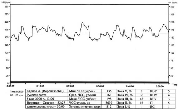 Рис. 2. Динамика ЧСС в игре с обоюдоострым нападением и защитой у спортсмена команды-победителя Помимо анализа соревновательной интенсивности игр команды изучались индивидуальная активность и характер ответных реакций у ведущих игроков в наиболее ответственных встречах. На рис. 1 приведена динамика пульсовой кривой игрока команды Воронежа в соревнованиях на Первенство России 2000 г. среди юношей 16 -18 лет в победном матче с серебряным призером командой г. Северска Томской области, завершившимся со счетом 53:27. Встреча прошла с преимуществом команды Воронежской области, которая переиграла своих соперников, совершив больше ТТД в нападении. Соответственно динамике соревновательной борьбы изменялась и функциональная активность в игре, что нашло свое отображение на приводимом рисунке. Величина пульса игрока в период матча изменялась со 135 до 198 уд/мин, среднее значение за игру составило 163 уд/мин. Соревновательная нагрузка по зонам интенсивности в игре распределилась следующим образом: в зоне V игрок соревновался 1 мин 30 с (выше индивидуальных значений пульса по результатам фитнес-теста), что составило 3%; в зоне IV - 18 мин, (36%); в зоне III - 22 мин 30 с (45%); в зоне II - 8 мин (и 3 мин тайм-аутов), что составило 16%. Общее время матча - 53 мин. Структура индивидуальных соревновательных действий была такова: количество выполненных ударов - 5, правильных ударов - 4, результативных ударов - 3, перебежек - 5, взятых свечей -1. На рис. 2 приведена динамика пульсовой кривой игрока команды Воронежа в полуфинальном матче с бронзовым призером - командой Уфы, завершившемся со счетом 30:28. Педагогические наблюдения позволили заключить, что встреча носила обоюдоострый характер с равномерным временным распределением игровых действий в нападении и защите. Причем для защитных ТТД характерна следующая динамика функциональной работоспособности: в зоне V игрок не соревновался; в зоне IV игра длилась 6 мин 1(2%); в зоне III - 12 мин 30 с (25%); в зоне II - 16 мин 30 с (33%); в зоне I игра продолжалась 15 мин (30%). Общее время матча - 51 мин (1 мин - тайм-аут). Величина пульса игрока в период матча изменялась со 107 до 204 уд/ мин, значение за игру составило 143 уд/мин. Структура индивидуальных СД была такова: количество выполненных ударов - 4, правильных ударов - 4, результативных ударов - 3, перебежек - 3, взятых свечей -3. Полученные данные стали основой для коррекции педагогического учебно-тренировочного процесса сборной Воронежской области по русской лапте. Спортсмены Воронежской области добились высоких результатов на Чемпионатах России: мужчины - 2000 г. - 1-е место, 2001 г. - 2-е место, 2002 г. - 3-е место; 2001 г. - чемпионы IV Всероссийских летних сельских спортивных игр; 1999, 2000 гг. - победители Первенства России среди юношей 16 -18 лет, 2002 г. - серебряные призеры; 2001 и 2002 гг. - студенты ВГАСУ стали чемпионами среди вузов, ССУЗов и общеобразовательных заведений. В итоге подготовлено 11 МС России по русской лапте и 10 КМС спорта резервного юношеского состава. Выводы Таким образом, тренировочную деятельность игроков в лапту необходимо строить с учетом основных параметров их СД. Современные тенденции развития игровой соревновательной деятельности юных и квалифицированных игроков в лапту характеризуются переходом от требований, предъявляемых к высокой динамичности игры юношей 16 -18 лет, выраженной количественными параметрами, движений