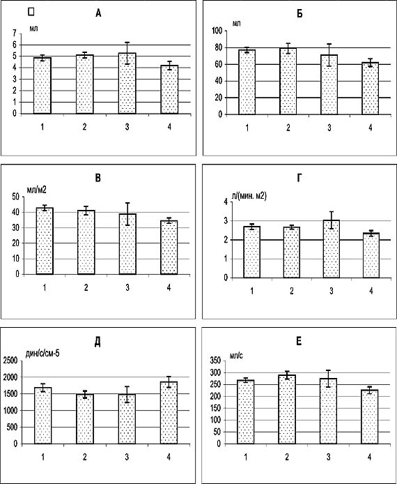 Рис. 1. Показатели гемодинамики МОК (А), УОК (Б), УИ (В), СИ (Г), ОПСС (Д), ОСВ (Е) в подгруппах по видам спорта: 1 - "игровые", 2 - "единоборства", 3 - "гребля", 4 - "гимнастика" Сравнение соотношения гемодинамических типов в выделенных группах показало, что среди студентов -разрядников низкий процент людей с гиперкинетическим и гипокинетическим типами, причем гипокинетического типа наблюдалось почти в три раза меньше по сравнению с группой "неразрядников", и более высокий процент с эукинетическим типом. При этом многие авторы указывают на то, что работу сердца у лиц с эукинетическим типом гемодинамики можно охарактеризовать как наиболее экономичную [4, 7]. Поэтому можно предположить, что сердце у "разрядников" работает в более выгодном, более экономичном режиме. Далее исследуемые показатели были проанализированы в подгруппах по видам спорта. По общепринятой классификации физических упражнений, предложенной В.С. Фарфелем, единоборства и спортивные игры относятся к видам спорта с нестандартными, или ситуационными движениями [12]. Они характеризуются смешанной (циклической и ациклической) структурой движения, с преобладанием динамической скоростно-силовой работы. В данных видах спорта вместе с постоянными изменениями структуры двигательных действий и направлений движений наблюдается переменная мощность работы (от максимальной до полной остановки спортсмена). Энерготраты в ситуационных упражнениях сравнительно ниже, чем в циклических. Ведущими системами являются центральная нервная система, сенсорные системы, двигательный аппарат. Стандартные циклические движения выполняют спортсмены, занимающиеся греблей. Здесь преобладают нагрузки анаэробно-аэробного характера. Ведущими физиологическими системами обеспечения работоспособности являются кислородтранспортные системы - кровь, кровообращение и дыхание, а также центральная нервная система. Для гимнастов характерны стандартные ациклические движения, где сочетается динамическая и статическая работа анаэробно-аэробного характера, которые по длительности выполнения соответствуют зонам максимальной и субмаксимальной мощности. Суммарные энерготраты у гимнастов невысоки из-за краткости выполнения упражнений. Ведущими физиологическими системами являются центральная нервная система, сенсорные системы, двигательный аппарат [12]. Самой старшей была подгруппа "единоборцев" - 18,83±0,54 года, достоверно старше (p<0,05) по сравнению с "игровыми " видами спорта и" гимнастами ". Самой младшей оказалась подгруппа "гимнастов ", имеющая достоверно меньший (p<0,05) возраст по сравнению с "гребцами " (табл. 3). Рост в подгруппах по видам спорта был самым большим у "единоборцев". Вес и окружность грудной клетки у единоборцев также были достоверно выше (p<0,05) по сравнению с тремя остальными подгруппами. У "гимнастов " ОГК наименьшая. У студентов, занимающихся греблей, наблюдается самое низкое значение ЖЕЛ, достоверно ниже (p<0,05) по сравнению с "единоборцами ". У студентов "игровых" видов спорта и у "гимнастов" показатель ЖЕЛ находился примерно на одном уровне (см. табл. 3). Таким образом, подгруппа "единоборцев " существенно выделялась по антропометрическим показателям. Мы полагаем, что это обусловлено как их большей физической сформированностью (по данным [7] физическое развитие существенно увеличивается с 17 до 18 лет и
