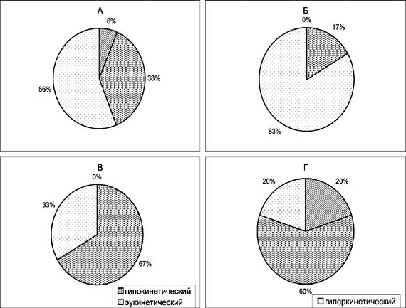Рис. 2. Соотношение типов гемодинамики в подгруппах по видам спорта: А - "игровые", Б - "единоборства", В - "гребля", Г - "гимнастика" Анализ соотношения типов гемодинамики по видам спорта у студентов-"разрядников" выявил, что наибольший процент юношей с гиперкинетическим типом наблюдался среди тех, кто занимается единоборствами и игровыми видами спорта (83 и 56% соответственно), у "гимнастов" же и студентов, занимающихся греблей, эти доли имели близкие процентные значения и были меньше (20 и 33% соответственно). При этом в литературе наличие гиперкинетического типа кровообращения в покое характеризуется как ограничивающее резервные возможности гемодинамического ответа на фоне физических нагрузок [7, 8]. Гребцы и гимнасты имели наибольший процент людей с эукинетическим типом гемодинамики (67 и 60% соответственно) по сравнению с другими подгруппами. Необходимо отметить отсутствие гипокинетического типа в подгруппах единоборцев и гребцов. Относительно больший процент его был представлен у "гимнастов" по сравнению с "игровыми" видами спорта (20 и 6% соответственно) (рис. 2). Гипокинетический тип является наиболее экономичным, так как сердечно-сосудистая система при этом обладает большим динамическим диапазоном [4, 7].