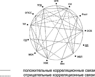Рис. 3. Диаграмма корреляционных связей антропометрических и гемодинамических показателей по общей группе студентов Для определения взаимосвязи между исследуемыми показателями был проведен корреляционный анализ. На рис. 3 показаны достоверные (p<0,05) корреляционные связи между показателями. Наблюдается большое количество связей между основными показателями физического развития, что свидетельствует о пропорциональности и гармоничности телосложения юношей этого возраста. Важно отметить наличие положительных корреляционных связей между типом гемодинамики и такими гемодинамическими показателями, как МОК, УОК, УИ, СИ, ОСВ, а также отрицательные корреляционные связи гемодинамики с ЖЕЛ и ОПСС. То есть чем больше ЖЕЛ и ОПСС, тем тип гемодинамики ближе к гипокинетическому, и наоборот, чем меньше ЖЕЛ и ОПСС, тем ближе тип гемодинамики к гиперкинетическому. Таким образом, полученные результаты согласуются с данными литературы о том, что тип гемодинамики определяется антропометрическими показателями, поскольку ЖЕЛ, в свою очередь, связана с ними (рост, вес, ОГК) положительными корреляционными связями и реципрокными отношениями периферического сопротивления (ОПСС) и других гемодинамических характеристик СИ, УИ, МОК [13, 18]. Выводы. 1. Для группы обследованных студентов в целом характерны гармоничность физического развития, а также преобладание гиперкинетического типа гемодинамики. 2. У студентов с разным уровнем физической подготовленности антропометрические показатели имеют сходные значения. Среди студентов с высоким уровнем физической подготовленности значительно ниже процент испытуемых с гипокинетическим типом по сравнению со студентами с низким уровнем физической подготовки. 3. Антропометрические характеристики и особенности гемодинамики специфичны для видов спорта: спортсмены-единоборцы имеют большие антропометрические показатели (рост, вес, ОГК) по сравнению с "игровиками", "гребцами" и "гимнастами"; у "игровиков" и "единоборцев" преобладает гиперкинетический тип гемодинамики, а у "гребцов" и гимнастов - эукинетический. Литература 1. Апанасенко Г.Л. Характер саморегуляции кровообращения как критерий устойчивости организма к внешним воздействиям // Космическая биология и авиокосмическая медицина. 1975, № 1, с. 56-59. 2. Гундаров И.А., Пушкарь Ю.Т., Константинов Е.Н. О нормативах центральной гемодинамики, определяемых методом тетраполярной грудной реографии // Тер. арх. 1983, № 4, с. 26-28. 3. Дембо А.Г., Земцовский Э.В. Спортивная кардиология: Руководство для врачей. Л.,1989. - 464 с. 4. Зияев Ю.Н., Никитин Н.П., Гоур Шундор Шаха. Реакция на физическую нагрузку в зависимости от типа кровообращения // Мед. Журнал Узбекистана. 1991, № 8, с. 57-60. 5. Киеня А.И., Бандажевский Ю.И. Здоровый человек: основные показатели: Справочник. Минск, 1997. - 108 с. 6. Коркушко О.В. Гемодинамика и возраст // Физиология человека. 1976, т. 2, № 4, с. 633-638. 7. Лёвушкин С.П. Комплексная оценка физической работоспособности юношей // Физиология человека. 2001, т. 27, № 5, с. 68-75. 8. Маколкин В.И., Аббакумов С.А., Бажанов Н.Н. и др. Состояние центральной гемодинамики у больных нейроциркуляторной дистонией в покое и при проведении тестов с нагрузкой // Кардиология. 1987, т. 27, № 12, с. 62-65. 9. Осколкова М.К., Вульфсон И.Н. Возрастная динамика основных функциональных показателей системы кровообращения у здоровых детей // Фи