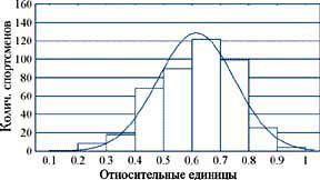 Рис. 1. Распределение по показателю "устойчивость" всей изученной группировки спортсменов (n= 483, женщины и мужчины) Анализ показателей "мобилизационность" и "самоконтроль" проводился аналогично, с распределением на классы. Мобилизационность . Средние значения показателя изменялись от 0,53 до 0,66 о.е. Высокое значение мобилизационности показали спортсмены игровых командных видов. В группу со средними значениями мобилизационности переместились спортивные единоборства. Остальные виды спорта практически остались на прежней позиции относительно положения по показателю "устойчивость". Самоконтроль. Средние значения показателя изменялись от 0,48 до 0,64 о.е. Высокий самоконтроль выявлен у представителей циклических видов. Изменения в положении мест относительно показателя"устойчивость" коснулись в первую очередь игровых командных видов. В данном случае они показали более низкий самоконтроль, чем спортсмены циклических видов. Невысокий самоконтроль продемонстрировали также спортсмены игрового индивидуального вида (настольный теннис). Спортивные единоборства заняли в целом среднюю позицию. Исключение составили таэквондисты. Для практической работы может быть использована оценка показателей соревновательной психической готовности методом сигмальной классификации, результаты которой представлены в таблице. Шкалы оценок показателей психической готовности к соревновательной деятельности (устойчивость, мобилизационность, самоконтроль) имели близкие значения. Достоверность различий показателей соревновательной готовности спортсменов разных специализаций рассчитывалась по критерию Стьюдента. Результаты исследования взаимообусловленности соревновательной психической готовности и показателей личности спортсменов. При изучении психической готовности к соревновательной деятельности, рассматривалась взаимосвязь ее показателей ("устойчивость", "мобилизационность", "самоконтроль") с характеристиками структуры личности по Кэттеллу (16-PF), Айзенку (YPI), Шмишеку (SHPI), Гордону (СПМ). Корреляционный анализ результатов исследования показал тенденцию к взаимной обусловленности психической готовности к соревновательной деятельности и показателей личности спортсменов. Устойчивость положительно связана с самоконтролем (r=0,47), мобилизационностью (r=0,42), силой нервной системы (r=0,29), психологической гибкостью (r=0,24), смелостью (r=0,23), интеллектом (r=0,12), оптимизмом (r=0,12) и отрицательно - с показателями, которые по величине корреляции были разделены на две группы факторов. К первой группе отнесены нейротизм по Айзенку (r=-0,56), невротичность по Гордону (r=-0,54), напряженность (r=-0,52), депрессия (r=-0,51), чувство вины (r=-0,47), тревожность (r=-0,45). Они наиболее существенно влияют на психическую готовность к соревновательной деятельности и успешность выступления в конкретном соревновании. Данные показатели были отнесены к определяющим текущее психологическое состояние спортсмена. Ко второй группе отнесены изменчивость настроения (r=-0,37), возбудимость (r=-0,31), агрессивность (r=-0,29), экзальтированность (r=-0,28), страх (r=-0,25), злопамятность (r=-0,23), педантичность (r=-0,23), пессимизм (r=-0,21), подозрительность (r=-0,20), сверхчувствительность (r=-0,19). Данные показатели были отнесены к входящим в структуру личности, т.е. конституциональным, относительно постоянно составляющим ли