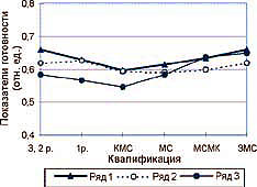Рис. 2. Динамика показателей соревнователь ной готовности с ростом квалификации. "Устойчивость" (ряд 1), "мобилизационность" (ряд 2), "самоконтроль" (ряд 3). Результаты сравнения показателей личности спортсменов разной психической готовности к соревновательной деятельности. При оценке показателей психической готовности к соревновательной деятельности (устойчивость, мобилизационность, самоконтроль) в результате дескриптивного анализа были выделены две группы спортсменов: с высоким (0,8-1,0 о.е.), и низким (0-0,4 о.е.) уровнем показателя "устойчивость" (рис. 1). Сравнение указанных группировок по другим показателям, изучаемым в исследовании, показало, что спортсмены с высокой и низкой устойчивостью имеют разную структуру личности. Данные группы были идентифицированы как спортсмены с высокой и низкой психической готовностью к соревновательной деятельности. Спортсмены с высокой психической готовностью к соревновательной деятельности характеризуются высокими значениями показателей устойчивости (0,84±0,03), мобилизационности (0,66±0,12), самоконтроля по УМБК (0,66±0,13), интеллекта (8,44±1,94), смелости (17,4±3,35), психологической гибкости (13,8±3,0), самоконтроля по 16-PF (14,12±2,95), оптимизма (19,5±4,43), сильной нервной системы, уравновешенных нервных процессов. Спортсмены с низкой психической готовностью к соревновательной деятельности характеризуются высокими значениями показателей агрессивности (0,62±0,2), доминантности по СПМ (0,66±0,11), депрессии (0,54±0,13), страха (0,36±0,16), невротичности (0,75±0,15), чувствительности по 16-PF (10,78±3,45), подозрительности (10,63±3,42), проницательности (10,02±2,88), чувства вины (13,73±4,45), напряженности (15,76±4,36), нейротизма (16,05±4,29), злопамятности (14,68±3,05), сверхчувствительности по SHPI (14,13±5,02), педантичности (13,21±3,55), тревожности (13,57±5,21), изменчивости настроения (19,18±4,61), возбудимости (15,86±4,97), пессимизма (9,23±4,64) и экзальтированности (19,26±5,43). Спортсмены с высокой и низкой психической готовностью имеют близкие значения следующих показателей: "юмор" (0,73±0,13), "демонстративность" по СПМ (0,45±0,15), "приобретательство" (0,61±0,16), "общительность" (0,72±0,14), "сексуальность" (0,62±0,24), "игровой потенциал" (0,44±0,17), "коллективизм" (0,61±0,16), "эмоциональность" (11,84±2,59), "беспечность" (15,92±3,41), "совестливость" (12,64±3,84), "мечтательность" (10,36±3,51), "самостоятельность" (6,8±2,71), "экставерсия" (16,0±3,17). Результаты исследования динамики психической готовности к соревновательной деятельности с ростом квалификации. При анализе изменения показателей обнаружено, что динамика психической готовности к соревновательной деятельности спортсменов квалификации от 2-го разряда до ЗМС аппроксимируется кривыми второго и третьего порядка. Высокую психическую готовность показывают начинающие спортсмены (относительно большой разброс данных) и спортсмены сборных команд (меньший разброс данных). У спортсменов средней квалификации (1-го разряда, КМС) психическая готовность более низкая, а самая низкая соревновательная готовность у КМС (0,59±0,11 о.е.), что можно объяснить высокой престижностью достигаемых результатов и неопределенностью положения в спортивной иерархии. На рис. 2 приводится динамика показателей психической готовности к соревновательной деятельности спортсменов с ростом квалификации от 2-го разряда до ЗМС. Исходя из результатов исследования можно рекомендовать планирование процесса многолетней спортивно