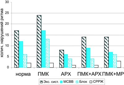 * - аномально расположенные хорды; ** - миграция супра водителей ритма; *** - синдром ранней ре-поляризации желудочков. При этом 1-я степень пролапса выявлена у 39 человек (33,1% ), 2-я - у 19 (16,1%). Больные прошли комплексное клинико-инструментальное обследование (запись стандартной ЭКГ и ее суточный мониторинг, анализ вариабельности сердечного ритма, ЭхоКГ с допплеровским исследованием кровотока). При проведении электрокардиографии и суточного мониторирования ЭКГ у этих больных выявлены нарушения сердечного ритма в виде желудочковой и предсердной экстрасистолии, МСВВР, блокады, синдром ранней реполяризации, синдром WPW (см. рисунок).