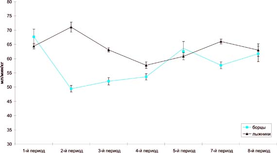 Изменение уровня МПК у борцов и лыжников в различные периоды годового цикла Из него видно, что у лыжников средний уровень МПК был значительно выше, чем у борцов, во время обследований, проводимых во 2, 3, 4 и 7-м сезонных периодах суточной освещенности. Характерно, что величина различий уровня МПК у борцов и лыжников максимальна во время прогрессивной и минимальна во время регрессивной динамики суточных значений фотопериода (2-й и 4-й периоды соответственно), приходящихся на соревновательный и переходный периоды макроцикла подготовки лыжников с соответственно максимальным и минимальными уровнями их физических кондиций. У борцов уровень МПК был наиболее высоким в период минимальных и максимальных значений суточной освещенности (1-й и 5-й периоды соответственно). Необходимо отметить, что в обоих случаях обследование спортсменов осуществлялось спустя 18-36 ч после их участия в соревнованиях. Следовательно, именно соревновательный характер физических нагрузок вне зависимости от уровня суточной освещенности в период их выполнения приводил к значительному повышению уровня аэробной работоспособности борцов, достигая при этом значений показателя, аналогичного таковому у лыжников. Наиболее высокий уровень значений МПК у лыжников также наблюдался в соревновательном периоде и полностью охватывал период прогрессивного и начало периода стабильного увеличения длительности дня (2-й и 3-й периоды соответственно). Можно полагать, что соревновательная деятельность вне зависимости от вида и способа состязаний, а также периода годичнго цикла сопровождается повышением уровня МПК у спортсменов. Во время стабильного увеличения длительности светлой части суток (3-й период) разница среднего уровня МПК у борцов и лыжников была такой же величины, что и во время стабильного уменьшения продолжительности дня (7-й период). Кроме того, средний уровень МПК у борцов во время исследований проводившихся в период с апреля по октябрь, коррелировал (r = 0,624; p< 0,01) со средними значениями уровня МПК у лыжников в сопоставимые сроки исследования (интервал между обследованиями - не более 10 суток). Корреляционная связь между уровнем МПК у лыжников и борцов не проявлялась при сопоставлении данных, полученных в период с ноября по апрель, или при анализе данных за весь годовой цикл. Неслучайный характер этой корреляционной связи обусловлен тем, что корреляционному анализу были подвергнуты данные, полученные на протяжении нескольких макроциклов. При этом, несмотря на то что система воздействий на организм, в частности система спортивной подготовки, как у борцов, так и у лыжников ежегодно претерпевала определенные изменения, корреляционная связь между средними значениями уровня МПК у борцов и лыжников в период с апреля по октябрь была статистически значимой. По нашему мнению, эта корреляция служит проявлением действия общего для обследованных групп фактора или системы условий, значимо влияющих на уровень МПК спортсменов в период с апреля по октябрь. Обобщая вышеизложенное, можно предположить, что в условиях отсутствия напряженных соревновательных нагрузок эффективность методик тренировки относительно их воздействия на уровень МПК спортсменов в значительной мере находится под модулирующим влиянием сезонной динамики солнечного освещения. При этом соревнов
