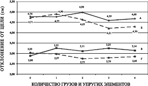 Рис. 2. Точность максимально быстрых точностных движений при воздействии сил различной природы: А - 10 см F тяж., Б - 10 см F упруг., В - 20 см F тяж., Г - 20 см F упруг. Точность движений на 20 см во всех случаях намного выше, чем на 10 см (p<0,001). Причем следует отметить, что точность растет пропорционально длительности движения к цели, а не амплитуды реверсивного точностного движения и вопреки росту максимальной скорости. Это подтверждает вывод о ведущем значении для сложности программирования максимально быстрого точностного движения именно его времени, изменение которого увеличивает или уменьшает степень последовательности актуализации элементарных двигательных программ [5]. Анализ данных эксперимента позволяет заключить, что даже при значительном влиянии внешних сил на биомеханическую структуру максимально быстрого точностного движения, существенной трансформации взаимосвязей между еe элементами, выразившихся в достоверных изменениях временных и пространственно-временных характеристик движений, результат движений как механической части точностных двигательных действий, их точность оказались стабильными. Данные о стабильности точности при изменении внешних сил тяжести и упругости и ее возможной динамике и их причинах не только согласуются с выводами [9] о том, что движения программируются в строгом соответствии с инерционными характеристиками сегментов тела, но и показывают механизмы достижения такого соответствия. Полученные результаты позволяют сделать два основных вывода, значимых для теории и практики физического воспитания и спорта. Во-первых, разнонаправленная динамика точности при увеличении массы щупа и числа упругих элементов, противодействующих движению к цели, дает основание считать увеличение массы рабочих сегментов тела, участвующих в точностном движении, отрицательным, а увеличение упругости рабочих мышц - положительными периферическими факторами в достижении точности. Это, в свою очередь, определяет выбор методов силовой подготовки при повышении эффективности двигательных действий, требующих значительного проявления точности и силы. Во-вторых, изменение инерционных характеристик щупа (и предположительно сегментов тела) и силы упругости, препятствующей движению (упругости антагониста), оказывают воздействие на центральный аппарат управления, который в целом успешно справляется с новой биомеханической ситуацией. Так как в результате применения большинства методов развития силы в той или иной мере возрастает и масса мышц, и их упругость, то эти два фактора влияют на точность движений и в значительной мере компенсируют друг друга. Литература 1. Бен Саид Нуреддин, Голомазов С.В. Индивидуальные особенности проявления электромеханического интервала и точность двигательных действий // Юбилейный сборник трудов ученых РГАФК, посвященный 80-летию академии. Т. 1. - М.: ФОН, 1997, с. 65-69. 2. Верхошанский Ю.В. Программирование и организация тренировочного процесса. - М.: ФиС, 1985. - 176 с. 3. Воробьёв А.Н. Тяжелоатлетический спорт. Очерки по физиологии и спортивной тренировке. - М.: ФиС, 1977, с. 46-48. 4. Голомазов С.В. Теоретические основы и методика совершенствования целевой точности двигательных действий: Докт. дис. М., 1996, с. 176. 5. Доронин А.М., Немцев О.Б., Поляков С.В. Влияние силовой нагрузки на временную структуру движений // Акту