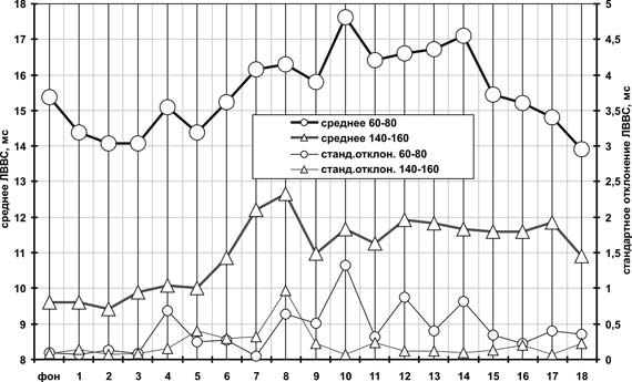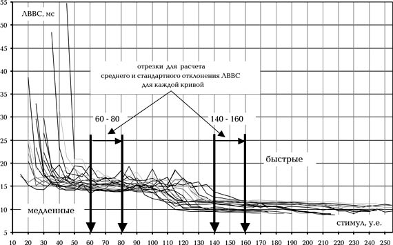 Рис. 3. Графики зависимости ЛВВС от величины стимула после серии дозированной физической нагрузки ChronAx-2003 имеет два режима автоматической работы: поисковый и рабочий. В поисковом стимулы следуют с дискретностью в 15 у.е. до первого срабатывания датчика акустического ответа мышцы. После этого прибор переходит в рабочий режим, в котором он возвращается на 15 у.е. назад и продолжает работу с дискретностью в 5 у.е. до сигнала принудительной остановки либо до верхней границы стимула 100 ma. Стимулы подаются через одинаковые промежутки времени в 500 мс. Значения ЛВВС и стимула выводятся на алфавитно-цифровое табло для контроля исследователем. Прибор имеет выход на ПК, на котором установлена рабочая программа, выполненная в виде базы данных для сбора, хранения и выдачи информации. Далее приводятся результаты эксперимента по оценке утомления НМА спортсмена по ЛВВС, полученные в ходе выполнения дозированной механической нагрузки. При этом серии ЛВВС чередовались с нагрузкой скоростно -силового характера, в которой ведущую роль исполняли икроножные мышцы. Спортсмен выполнял на простейшем устройстве циклические сгибания-разгибания стопы, при этом амплитуда движения контролировалась конечными ориентирами, режим работы был обусловлен весом спортсмена, словесной установкой, но по параметрам не контролировался. Эксперимент по согласованию со спортсменом проводился "до отказа". Данные всех серий измерения ЛВВС графически представлены на рис. 3 семейством ломаных линий (фоновое тестирование и последующие 18 после очередных физических нагрузок). Не анализируя здесь динамику H-рефлексов, отметим, что при малых значениях градаций стимулов в работу включались медленные мышечные волокна с большой длительностью ЛВВС, а дальнейшее увеличение стимула активизировало быстрые мышечные волокна. Нами условно выделены две зоны характерных М-ответов, которые показаны на рисунке и названы зонами медленных и быстрых волокон. В каждой из них икроножная мышца стимулировалась по 5 градациям стимула. Для каждой ломаной в выделенных зонах вычислялись средние значения и стандартные отклонения ЛВВС по 5 градациям стимула. Анализируя динамику средних значений и стандартного отклонения ЛВВС в сериях тестирований конкретного спортсмена (рис. 4), мы отметили совпадение времени выхода на максимумы указанных показателей с субъективными жалобами испытуемого на усталость, после чего в реальном процессе он бы прекратил тренировочное воздействие (8-10-я серии нагрузок). Показательно совпадение ЛВВСmax c максимумами дисперсий. Очевидно, что переключению НМА на работу быстрых волокон предшествовал переходный период, представленный на рис. 3 своеобразной ступенью в динамике ЛВВС. Этот скачок показателей ЛВВС наблюдался в диапазоне стимулов 85 - 135 у.е. По-видимому, в соответствии с известным принципом перемежающейся активности в переходном периоде по мере увеличения градаций стимула в отдельно взятом тесте происходит постепенное перераспределение мышечной активности в направлении вовлечения в сократительный акт быстрых волокон. При этом необходимо было учитывать, что каждое тестирование происходило на фоне предшествующей механической нагрузки, т.е. в динамике некоторого гипотетического индикатора утомления НМА в этом периоде должны были отражаться специфическ