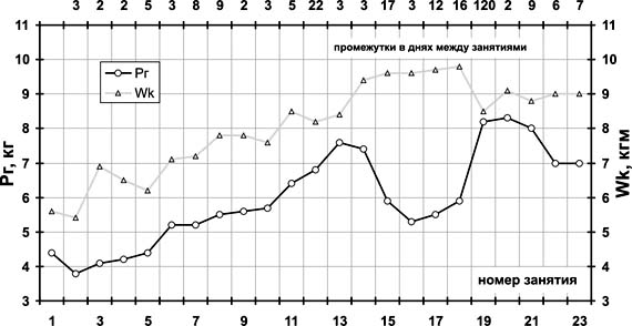 Реализуя различные тренировочные программы скоростно-силовой направленности, мы сталкиваемся с нерешенными вопросами, связанными с соотношением "сила-скорость" при выборе величины отягощений, не только оказывающим влияние на оперативное и текущее состояние организма спортсменов, но и отражающимся в конечных результатах программы - кумулятивном эффекте тренировки. Комплексно решать эти вопросы можно лишь при наличии критериев оценки названных состояний, т.е. вначале оценивать состояние нервно-мышечного аппарата (НМА), затем на этой основе производить выбор величины отягощения, а далее отслеживать кумулятивный эффект тренировки под контролем используемых критериев. Далее мы рассмотрим результаты такого показательного процесса тренировки, когда в самом элементарном упражнении (подъем рывком груза, подвешенного на крюке блочного устройства, одной рукой в вертикальной плоскости, с максимально возможной скоростью движения) с помощью технических средств оснастки тренажерного устройства регистрировалась скорость разгона груза. Это позволяло рассчитывать кинетическую энергию разгона груза в каждой попытке упражнения. Особенностью организации тренировочных занятий спортсменки, мастера спорта по метанию диска, было использование математической модели движения, позволяющей рассчитывать величину груза, в движении с которым прогнозировался максимум кинетической энергии его разгона [4]. Организация каждого занятия на тренажерном устройстве выглядела следующим образом. Вначале тестировалась абсолютная сила Fmax в тяге рукой из исходного положения при жестко закрепленном тросе, а по кривой F(t) определялось время T0 достижения максимума крутизны этой кривой, характеризующее реактивность НМА. Затем по математической модели движения рассчитывался номинал отягощения Рг с максимумом кинетической энергии разгона груза в предстоящем движении. Соотношение попыток в статическом и динамическом режимах работы составляло 3:5. Текущее и все последующие занятия представляли собой сочетание серий из 3 статических и 5 динамических тестов с подъемами груза Pr, изменяющегося в динамическом режиме по величине, соответствующей оперативному состоянию НМА. Детальное рассмотрение условий эксперимента можно найти в монографии [6]. Каждое занятие продолжалось до выхода спортсменки на максимум (плато) показателей усредненной результативности динамических тестов из 5 попыток. Затем усреднялись показатели результативности всех динамических тестов занятия. На рис. 1 показана динамика этих усреднённых показателей результативности Wkmax и отягощения Pr по всем проведенным занятиям. В представленной динамике отразились характерные особенности тренировки скоростно-силовой направленности: постепенный рост средней результативности упражнений при одновременном смещении номинала Pr в область больших значений. Здесь проявился хронический эффект подобного рода тренировок, о котором все знают, а тяжелоатлеты даже применяют специальный методический прием "отойти от объема" [9]. Однако в нашем случае раскрылся механизм этого хронического эффекта потери быстроты движений: повышение показателей абсолютной силы тяги Fmax и времени T0 достижения максимума крутизны кривой F(t) приводило к прогнозу все больших номиналов Pr. Продолжение тренировок такой