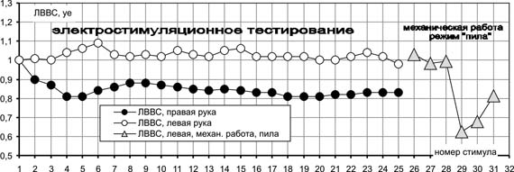 Заключительный эксперимент анализируемого цикла провели через 7 дней - для выравнивания исходного состояния обеих рук. Эксперимент отличался от предыдущих тем, что руку с исходно лучшим состоянием нагрузили "медленным" режимом работы, а другую - "быстрым". Эффект нагрузок был диаметрально противоположным: "быстрый" режим снижал уровень ЛВВС, т.е. улучшал состояние НМА, а "медленный" - ухудшал. Таким образом, нейромоторная специфичность мышечной нагрузки, отразившись на характере адаптационных перестроек НМА, проявилась в характерной динамике показателей ЛВВС. Это обстоятельство было отправной точкой для формирования рабочей гипотезы дальнейших исследований: показатели ЛВВС могут использоваться в качестве индикаторов при оценке состояния периферии НМА и выявлении характерных тенденций развития срочного и текущего тренировочного эффектов, а их уровень и темпы изменения - для оценки специфических способностей индивидуумов к работе скоростно-силового характера. При организации исследования по обозначенным вопросам и ввиду необходимости выхода на кумулятивный эффект тренировок требовалось уточнить вопросы построения организации каждого тренировочного занятия, т.е. определиться с критерием утомления в работе скоростно -силовой направленности, которое мы уже связывали с состоянием периферии НМА и со спецификой скоростно -силовых упражнений. Проведенными ранее исследованиями показано, что ЛВВС оказалось физиологически корректно связанным с функциональным состоянием периферической части НМА, тестируемого по ходу занятия [1]. Однако эти исследования проводились на описанном выше комплексе, возможности которого не позволяли получать оперативную информацию, пригодную для реализации функций управления. Таким образом, фактически был поставлен вопрос о создании АРМ (автоматизированного рабочего места) тренера, позволяющего управлять тренировочным процессом в реальном масштабе времени. Действительно, можно располагать критерием оценки оперативного состояния НМА, но если необходимая далее информация появляется после ручных операций обработки и представления данных, то ее использование становится несвоевременным для оценки текущего состояния спортсмена и станет несовершенным либо невозможным само управление процессом. Современные компьютерные технологии позволили Г.К. Павлову разработать прибор ChronAx-2003, который создан на элементной базе с высокой интеграцией (микроконтроллер со встроенными 8-канальным десятиразрядным АЦП и интерфейсом ввода-вывода) и с гибко изменяющейся структурой работы, в соответствии с заданным алгоритмом исследования в реальном масштабе времени. Прибор позволяет сканировать ЛВВС при изменении величины электрического стимула в интервале от 0 до 100ma (0-255 у.е.).