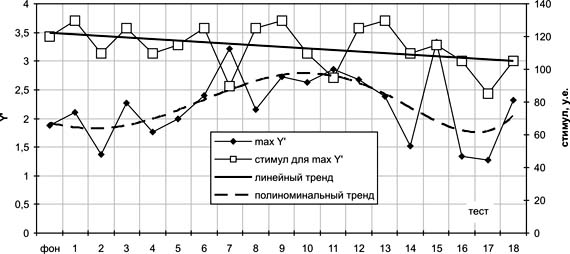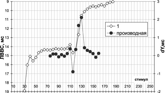 Рис. 4. Динамика средних величин и стандартных отклонений ЛВВС медленных и быстрых мышечных волокон при увеличении объема нагрузки В то же время известно, что при возбуждении мышечных волокон и нарастании концентрации кальция в саркоплазме активируются актомиозиновые мостики, но сокращение начинается с некоторой задержкой по отношению к стимулу. Длительность задержки не зависит от способа стимуляции, начальной длины и связывается исследователями также с особенностями ЭМС [9]. Логично было предположить, что ЛВВС не выпадает из цепи взаимосвязанных интервалов (ЛВВС- T(dP/dt)max - ВДМ) и тех процессов, которые в них происходят. Все изложенное позволяло допустить, что при изучении усталостных явлений в мышце следовало обратить внимание на динамику скорости изменения изучаемого показателя (dЛВВС/dI) в переходном периоде. На рис. 5 представлена динамика показателей ЛВВС по 32 градациям стимула в первой серии тестирований и линейные части приращений ЛВВС (дифференциалы изучаемой функции) на 17 градациях стимула, нанесенных с интервалом в 500 мс в переходном периоде. Шкала значений ЛВВС показана в обратном порядке для удобства качественного анализа. Как и ожидалось, проявилась характерная динамика в быстроте протекания хемофизических преобразований в переходном периоде. Начало и завершение этого периода характеризуются приближением скорости изучаемых процессов к нулевым значениям скорости текущей реакции (квазиустойчивое состояние). Очевидно, что в выделенных нами выше зонах ответов медленных и быстрых волокон (условное плато в динамике ломаных линий) именно такая характеристика состояния системы и должна наблюдаться. Во временном промежутке, отнесенном нами к переходному процессу, отмечено два экстремума производной. Первый из них индуцирует появление отрицательного приращения в изменении уровня ЛВВС, которое, по-видимому, отражает формирование сигнала к началу перехода НМА на новый уровень функционирования. Показательно, что этому моменту предшествовало два шага снижения уровня ЛВВС (улучшения показателя) при повышении градации стимула, что и привело к "срыву" устоявшегося режима функционирования системы: медленные двигательные волокна "попытались" отреагировать на возрастание стимула снижением уровня ЛВВС, но, вероятно, исчерпали свой энергетический ресурс, отраженный в скорости развертывания текущей (по-видимому, ключевой) реакции. Второй экстремум характеризует в некотором приближении максимум скорости изменения d(ЛВВС)max уровня ЛВВС и координату стимула (по порядковому номеру тестирования ЛВВС) для точки перегиба кривой, аппроксимирующей ломаную линию ЛВВС. Следует помнить, что в этот момент ускорение рассматриваемого переходного процесса достигло нулевого уровня, а далее изменило свой знак, т.е. появились тенденция к замедлению скорости текущего процесса и переход системы на новый квазистабильный уровень функционирования в ответ на предложенную нагрузку (стимул). Следующим шагом в изучении характерных особенностей переходного периода было изучение динамики найденных значений d(ЛВВС)max по сериям тестирования ЛВВС (рис. 6), т.е. в связи с усталостными явлениями. Предварительно следует заметить, что в структуре системы управления объединяются управляющее устройство, управляемый объект и информационные каналы