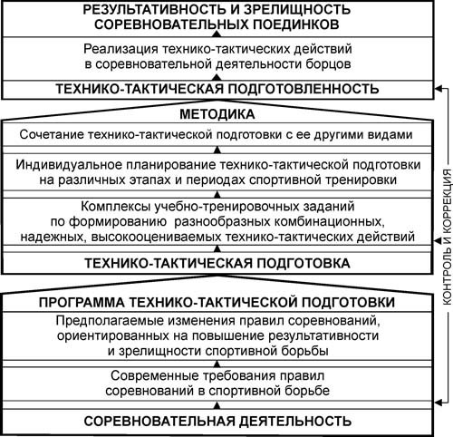 Модель процесса совершенствования технико-тактического мастерства борцов Модель включает: характеристики соревновательной деятельности, методику подготовки, контроль и коррекцию процесса. Соревновательная деятельность содержит блоки, которые отражают фактическую и прогнозируемую технико-тактическую подготовленность. Данные блоки определяют программу технико-тактической подготовки квалифицированных спортсменов и являются первым уровнем модели. Методика включает использование комплексов учебно-тренировочных заданий, планирование технико-тактической подготовки на различных этапах и периодах спортивной тренировки, сочетание технико-тактической подготовки с другими ее видами. Функционирование деятельности блоков модели предусматривает контроль и коррекцию процесса технико-тактической подготовки. Структурный аспект модели предусматривает тесную взаимосвязь и взаимодействие основных блоков модели. Разработанная нами методика совершенствования подготовки квалифицированных борцов по предложенной модели позволяет сформировать и реализовать разнообразные комбинационные, надежные защитные и атакующие высокооцениваемые технико-тактические действия, которые в настоящее время редко используются в соревнованиях. Проведенный педагогический эксперимент показал статистически значимые изменения десяти показателей соревновательной деятельности. Так, например, значение надежности атакующих действий в положении борьбы стоя до эксперимента составило 0,33±0,12, а после эксперимента - 0,45±0,18 усл. ед. (р<0,05). Аналогичные изменения отмечены в показателе надежности атакующих действий в положении борьбы лежа. Это свидетельствует о том, что квалифицированные борцы выполняли технико-тактические действия, которые при меньшем количестве попыток оценивались чаще. Надежность защитных действий лежа значительно повысилась. Спортсмены проигрывали меньшее количество высокооцениваемых приемов в партере. На достоверном уровне улучшились показатели комбинационности атакующих действий в положении борьбы стоя и лежа. Борцы стали больше проводить высоко оцениваемых приемов в комбинациях с низко оцениваемыми технико-тактическими действиями, что также подтверждается увеличением показателей объема эффективной и соревновательной техники в положении борьбы стоя и лежа. Применение борцами греко-римского стиля более широкого арсенала приемов свидетельствует о росте их квалификации, умении выполнять разнообразные оцениваемые приемы с использованием комбинаций. Такое изменение показателей соревновательной деятельности обеспечило повышение уровня спортивного мастерства. Спортсмены ЭГ занимали на соревнованиях более высокие по сравнению с КГ места. Заключение. Проведенные теоретические и экспериментальные исследования позволили отметить следующее. Достижение победы путем интенсификации соревновательной деятельности спортсменов за счет превалирования физической подготовленности и применения ограниченного арсенала технико-тактических действий (одного, двух приемов) в будущем может предопределить возможные неудачи на соревнованиях самого высокого уровня: чемпионатах Европы, мира, Олимпийских играх. Современные правила спортивной борьбы претерпевали изменения и дополнения в течение многих лет и, как показыв