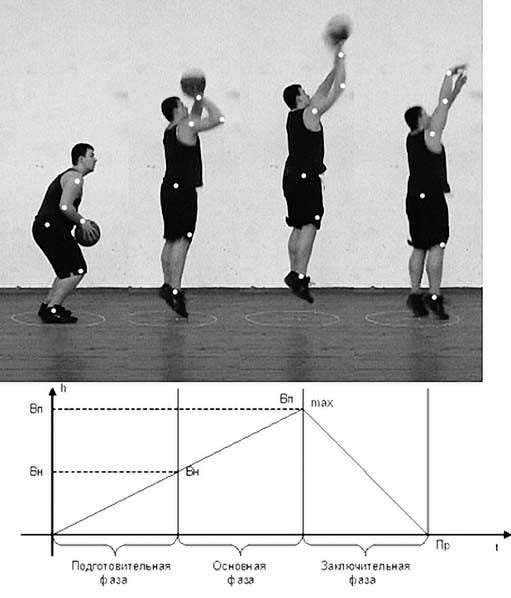 Видеограмма фазовой структуры броска мяча по кольцу в прыжке с места с дистанции. Ось ординат - высота выпрыгивания при выполнении броска по кольцу с дистанции. Ось абсцисс - время выполнения броска по кольцу в прыжке с дистанции. Вн - точка (время) завершения выноса мяча для броска. Вп - точка (время) выпуска мяча при броске в прыжке с дистанции На что же тогда необходимо обратить внимание, если все элементы уже освоены, что же является тем существенным отличительным параметром, который определяет мастерство владения данным техническим приемом? На наш взгляд, таким параметром является ритмическая структура броска в прыжке одной рукой с дистанции. Под ритмическим стереотипом понимается определенный временной стереотип, выражающий зафиксированную в определенном порядке последовательность и соотношение длительности фаз выполнения данного технического приема. При выполнении технических приемов этот стереотип носит, во-первых, индивидуализированный характер, обусловленный антропометрическими особенностями тела данного спортсмена, уровнем развития скоростно-силовых способностей, во-вторых, допускает определенную временную вариативность, обусловленную возникающими игровыми условиями его выполнения. Исходя из этого его можно определить как вариативный ритмический стереотип броска в прыжке с дистанции. Яркими примерами обладания таким вариативным ритмическим стереотипом являются известные игроки-снайперы прошлого и настоящего С. Белов, В. Сальников, М. Паулаускас, С. Бабков, А. Пашутин и мн. др. Чувство ритма выражается в точном воспроизведении направления, скорости, ускорения, частоты и других характеристик движений. Ритм отражает степень точности прилагаемых усилий, чередования фаз напряжения и расслабления. Чем выше чувство ритма, тем точнее спортсмены воспроизводят направление, скорость, частоту движения, тем правильнее могут расставить акценты - своевременно осуществлять усилия и ускорения. Основная задача при развитии чувства ритма состоит в поиске индивидуальных оптимальных ритмов двигательных действий. Поэтому целесообразная работа над повышением его уровня в каком-либо одном специализированном направлении положительно отразится на повышении точности восприятия ритмической структуры других вновь осваиваемых двигательных приемов, навыков. Задача формирования правильного ритма возникает уже на этапе начального разучивания. При овладении упражнениями иногда лучше сначала задать ритм, чем подробно описывать детали движений. Это помогает быстрее понять особенности изучаемого упражнения, его построение во времени. Педагог, тренер должен позаботиться о создании эталонного представления о ритмической структуре впервые изучаемого двигательного действия с помощью различных методических приемов. Прежде всего - это демонстрация совершенной техники двигательного действия с сосредоточением внимания на ритме. Показ целесообразно дополнить видеодемонстрацией в обычном и замедленных темпах со звуковым сопровождением, воссоздающим образ движений. Полезно и воспроизведение заданного ритма путем подсчета вслух и про себя. Повысить эффективность начального обучения можно посредством использования светои звуколидеров - автоматических устройств, задающих по определенному эталону формируемый ритм д