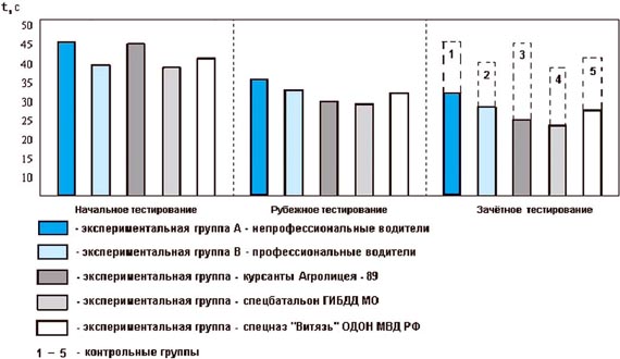 В автоспорте накоплен уникальный опыт интенсивной контраварийной подготовки, направленной на развитие и совершенствование водительского мастерства. Особенно актуально обучение сложнокоординационным приёмам активной безопасности (АБ), позволяющим преодолевать критические ситуации. Перенос этой технологии в сферу профессионально-прикладной подготовки позволит в кратчайшие сроки эффективно формировать структуру управляющих действий и повышать уровень мастерства у водителей различных категорий. Для подтверждения данной гипотезы были подготовлены экспериментальные группы водителей с целью исследования особенностей и закономерностей формирования навыков АБ в процессе контраварийной подготовки. Задачи исследования заключались в систематизации форм, средств, методов обучения и последующей оценке их эффективности. Начальный этап контраварийной подготовки связан с технологией тренажерного обучения. Тренажёрная подготовка состоит из базовых комплексов упражнений по формированию рациональных навыков управления в критических ситуациях: скоростное руление, работа педалями, переключение передач, развитие сложной двигательной координации контраварийных управляющих действий. Следующим этапом формирования контраварийных навыков является базовая автодромная подготовка, которая представляет собой подсистему обучения, позволяющую заложить прочные основы безаварийного управления автомобилем. Предмет обучения - прогрессивные приёмы, применяемые в автомобильном спорте, а также приёмы, разработанные в процессе исследования проблемы контраварийной подготовки. На рис. 1 представлены результаты начального, рубежного и зачётного тестирования скорости руления в пяти контрольных (КГ) и пяти экспериментальных (ЭГ) группах, проходивших курс тренажерной подготовки в Центре высшего водительского мастерства РГУФКа. Данный тест является стандартным при определении уровня водительского мастерства. В ходе тестирования выполняется 10 циклов руления двумя руками на тренажёрах различной степени сложности - от макетов органов управления, установленных в учебном классе, до автомобилей с вывешенной передней осью. Один цикл - это поворот рулевого колеса от упора до упора и возврат в исходное положение. По результатам начального тестирования можно заключить, что скорость руления во всех группах неудовлетворительная (в среднем 10 циклов руления осуществляются за 43 с). Минимальный норматив, определяющий безопасное преодоление критических ситуаций, составляет четыре управляющих движения в секунду, применительно к данному тесту - 28 с. В процессе рубежного тестирования выяснилось, что после нескольких интенсивных занятий по тренажерной контраварийной подготовке скорость руления в ЭГ повысилась в среднем на 23 % - время выполнения контрольного теста составляет 30-35 с. Средние результаты зачётного тестирования в ЭГ - 24-32 с. В сравнении с водителями таких же категорий в КГ, не проходивших тренажёрной подготовки, скорость руления у водителей ЭГ выше в среднем на 30-45 %. Это значительно повышает безопасность в экстремальных ситуациях.