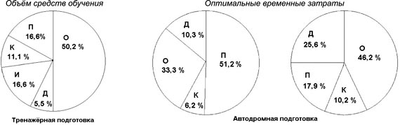Рис. 2. Соотношение учебных средств контраварийной подготовки. Условные обозначения: П - подготовительные упражнения, О - основные, Д - дополнительные, И - имитационные , К - контрольные За время тренажёрной подготовки было установлено соотношение тренировочных средств, обеспечивающих эффективное формирование сложнокоординационных навыков АБ. Упражнения контраварийной подготовки были классифицированы как подготовительные, основные, имитационные, контрольные и соревновательные. На рис. 2 представлены результаты статистической обработки объёма учебных средств, тренажёрной и автодромной подготовки. Доказано, что данное соотношение тренировочных средств обеспечивает эффективное формирование навыков АБ у водителей, обладающих необходимым уровнем физической подготовленности и мотивацией к самосовершенствованию. Экспериментальная работа, проведённая со спортсменами различной квалификации (всего 66 человек: 6 МСМК, 11 МС, 14 КМС, 16 перворазрядников, 19 второразрядников) в дисциплинах: ралли, кольцевые и трековые гонки, автомногоборье, - позволила установить, что наивысшие результаты в скорости руления были показаны спортсменами, специализирующимися в автомобильном многоборье, что объясняется сложным характером координационной деятельности при выполнении серий разнопланового маневрирования в ограниченном пространстве. У спортсменов скоростных видов автомобильного спорта (ралли, трековые и кольцевые гонки) показатели скоростного руления характеризуют защитные приёмы АБ для стабилизации автомобиля при потере устойчивости и управляемости.