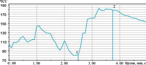 Рис. 1. Динамика средних значений ЧСС у курсантов в процессе выполнения упражнения № 2 из пистолета (НОП-2000) после предложенной физической нагрузки: 1 - начало выполнения физической нагрузки; 2 - начало выполнения стрельбы При сравнении результатов стрельбы после выполнения указанного варианта физической нагрузки с результатами стрелкового упражнения без нагрузки установлено, что при выполнении упражнения № 2 НОП-2000 среднее количество попаданий в первом случае составило 3,15 раза, во втором - 2,26 раза. В процессе математической обработки полученных данных по критерию Стьюдента установлено, что разница в результатах стрельбы достоверна (p<0,01). Это свидетельствует о том, что предложенный вариант физической нагрузки оказывает существенное "сбивающее" воздействие. Таким образом, можно считать, что вариант предложенной нами нагрузки наиболее пригоден из всех рассмотренных для использования в качестве стандартной универсальной физической нагрузки в сочетании со стрелковыми упражнениями в условиях тира. На предыдущем этапе исследования, когда мы сравнивали пульсовые значения и результаты стрельбы при выполнении упражнения № 2 стрельбы из пистолета НОП-2000 и выполнении этого стрелкового упражнения в сочетании с разработанным нами вариантом физической нагрузки, стрельба велась сменой. Возник вопрос: как будут влиять различные интервалы отдыха между окончанием физической нагрузки и началом стрельбы на пульсовые значения и результаты стрельбы? Иными словами, будут ли различаться результаты стрельбы при выполнении стрелкового задания после физической нагрузки не сменой, а по одному: у стреляющих в смене первыми, вторыми, третьими, четвертыми, пятыми и т. д.? Для получения ответа на поставленный вопрос нами был проведен специальный эксперимент: после 3-кратного повторения 10 выпрыгиваний из упора присев с махом руками вверх, 10 сгибаний и разгибаний рук в упоре лежа дальнейшее выполнение комплексного упражнения осуществлялось по одному с интервалом 20 с. Порядок выполнения упражнения был следующим: смена из 5 человек находилась на рубеже 30 м лицом к мишеням, пистолет с включенным предохранителем в кобуре на поясе сбоку, заряжен 4 патронами, которые находятся в магазине. Проверив готовность обучаемых, руководитель стрельб подавал команду "Марш!". По этой команде обучаемые в составе смены принимали положение упора присев и начинали выполнение комплексного упражнения. После трехкратного выполнения всей сменой 10 выпрыгиваний и 10 отжиманий стреляющий на первом направлении (№ 1) передвигался на огневой рубеж 20 м и выполнял 2 поворота прыжком на 360о (1 вправо, 1 влево). После этого руководитель подавал команду "Огонь!", по которой обучаемый выполнял стрелковое упражнение № 2 НОП-2000. По окончании стрельбы первым номером смены (через 20 с) на огневой рубеж выходил № 2, затем № 3 и т. д.