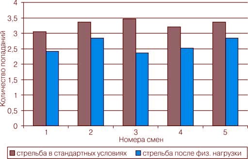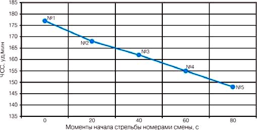 Рис. 2. Динамика ЧСС при выполнении упр. №2 - стрельбы из пистолета через кратные 20 с интервалы отдыха после предложенной физической нагрузки Величины ЧСС у курсантов различных номеров смены непосредственно перед началом и в процессе стрельбы представлены на рис. 2. После математической обработки и анализа полученных данных результатов стрельбы (рис. 3) обнаружено существенное снижение количества попаданий 3-ми номерами смен (p < 0,001), которые выполняли стрелковое упражнение примерно через 40 с после выполнения физической нагрузки функционального характера (выпрыгивания и отжимания) по сравнению с результатами выполнения этого стрелкового упражнения без физической нагрузки. На основании вышеизложенного можно сделать следующие выводы: 1. Интервалы отдыха между окончанием физической нагрузки и началом стрелкового упражнения в пределах от 20 с до 1 мин 20 с влияют на величину пульса в сторону понижения (со 178 до 149 уд/мин). 2. Наибольшее ухудшение результатов стрельбы происходит, когда стрелковое упражнение выполняется в фазе восстановления (40-я с) после выполнения нагрузки функционального характера (выпрыгивания и отжимания). Это говорит, во-первых, о необходимости учета момента первого выстрела при контрольной стрельбе; во-вторых - о возможности усложнения или облегчения условий стрельбы путем регулирования момента её начала после физической нагрузки. 3. Предложенный нами вариант физической нагрузки может быть использован для комплексирования с различными стрелковыми упражнениями, которые можно выполнять как в составе смены, так и по одному при минимальных затратах времени, без дополнительного оборудования и с возможностью дозирования воздействий в условиях стандартного тира.