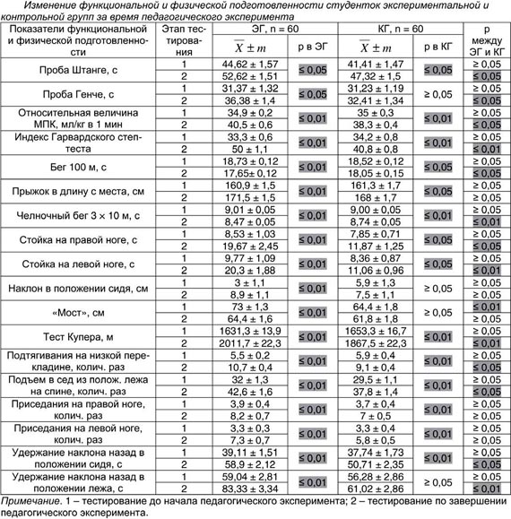 Методы и организация исследования. В исследовании приняли участие студентки 17-18 лет Омского государственного технического университета (n = 120), которые по результатам анкетирования и контрольных испытаний, были зачислены в учебные отделения общефизической подготовки. Основным учебным материалом на практических занятиях в этих учебных отделениях являлись общедоступные упражнения из легкой атлетики, спортивных игр, лыжных гонок и гимнастики. По графику изучения учебного материала раздел рабочей программы "Гимнастика" спланирован на ноябрь, декабрь, февраль, март и апрель в объеме 60 ч. На учебных занятиях по оздоровительной гимнастике в контрольной группе (КГ, n = 60) мы применяли традиционные общеразвивающие упражнения: по преодолению веса собственного тела; с гимнастическими палками, скакалками, гантелями; с использованием гимнастической стенки, гимнастической скамейки; прыжки на месте, в движении, через предметы; на растягивание мышц и связок и на расслабление мышц. В экспериментальной группе (ЭГ, n = 60) основными средствами физического воспитания на протяжении всех 30 практических занятий были асаны, дыхательные упражнения (полное дыхание, капалабхати, анулома-вилома), стато-динамические комплексы асан, релаксация. Для занятий были отобраны те упражнения, которые по координационной сложности соответствовали подготовленности студенток и были рекомендованы мастерами йоги на начальном этапе занятий хатха-йогой [4, 9, 10]. Примерная схема практического занятия по гимнастике хатха-йога: подготовительная часть - 20 мин; дыхательные упражнения капалабхати и полное дыхание - 10 мин; асаны - 15 мин; стато-динамический комплекс асан - 30 мин; релаксация - 10 мин; дыхательное упражнение анулома-вилома - 5 мин. При выполнении упражнений хатха-йоги соблюдались следующие условия: чередование физических напряжений и расслаблений; согласование движений и статических напряжений с дыханием; концентрация внимания на выполняемом упражнении. До начала педагогического эксперимента (октябрь) и по его завершении (апрель) мы проводили тестирование студенток по показателям функциональной и физической подготовленности: проба Штанге, проба Генче, максимальное потребление кислорода, Гарвардский степ-тест, бег на 100 м, прыжок в длину с места, подтягивания на низкой перекладине, подъемы в сед из положения лежа на спине, приседания на одной ноге, удержание наклона назад в седе, удержание наклона назад в положении лежа, челночный бег 3х10 м, стойка на одной ноге, тест Купера. Результаты исследования. До начала эксперимента уровень функциональной и физической подготовленности студенток обеих групп был примерно одинаков (см. таблицу). После завершения эксперимента и повторного тестирования нами обнаружено улучшение результатов по всем показателям в обеих группах, но более значительный их рост произошел в ЭГ. Повышение скоростно-силовых и силовых способностей студенток ЭГ мы объясняем тем, что при выполнении асан задействуется гораздо больше мышц, чем при выполнении силовых упражнений локального действия, которые мы применяли в КГ. Даже в дыхательных упражнениях и при глубоком дыхании, вызванном поточным способом выполнения асан, сокращаются не только специфические дыхательные мышцы (межреберные, диафрагма), но и мышцы груди, спины, живота (большая грудна