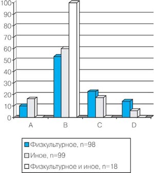Рис. 1. Структура мотиваций работы тренером в зависимости от типа полученного образования: A - не нашел себя в другом; B - призвание; C - спортсмену иного пути нет; D - "так получилось"