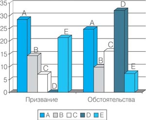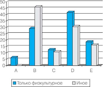 Рис. 3. Жизненные планы в зависимости от ориентации на тренерскую деятельность: A - работать с иным контингентом; B - уйти в сферу высшего образования; C - перейти на административно управленческую работу; D - работа тренером - не основная трудовая деятельность; E - ничего менять не хочет