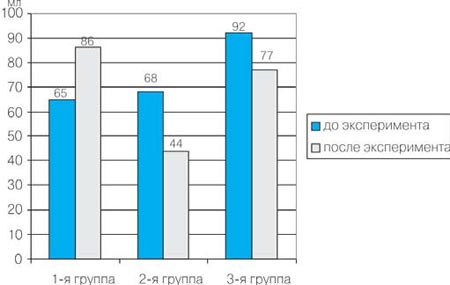 Рис. 6. Динамика среднего показателя ударного объема крови левого желудочка Представленные показатели позволяют оценить степень готовности сердечно-сосудистой системы к предельным нагрузкам. Спортсмены, относящиеся к 1-й группе, характеризуются высокой средней скоростью циркулярного укорочения волокон миокарда ЛЖ при максимальных нагрузках. Это позволяет считать, что у спортсменов этой группы волокна миокарда ЛЖ находятся в состоянии хорошего тонуса, что дает возможность выполнять максимальные по объему и интенсивности нагрузки. 2-я группа характеризуется снижением средней скорости циркулярного укорочения волокон миокарда ЛЖ. Это связано со слабой готовностью сердечно-сосудистой системы спортсменов к предложенным нагрузкам. Спортсмены 3-й группы имели достаточно большой перерыв в тренировке, поэтому скорость циркулярного укорочения волокон миокарда ЛЖ у них оказалась меньше, чем в 1-й группе. Таблица 1. Сопряженность признаков сердца
