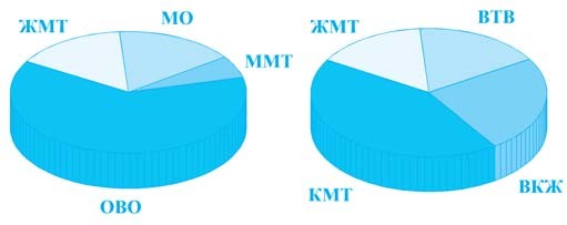 Рис. 3. Четырехкомпонентные модели состава тела [17, 21, 23, 41]. На диаграмме слева масса тела представлена в виде суммы ЖМТ, общей воды организма (ОВО), минеральной массы тела (ММТ) и массы ос татка (МО); на диаграмме справа - как сумма ЖМТ, клеточной массы тела (КМТ), массы внеклеточной жидкости (ВКЖ) и массы внеклеточных твердых веществ (ВТВ). Размеры секторов на рисунке соответствуют данным по условному человеку