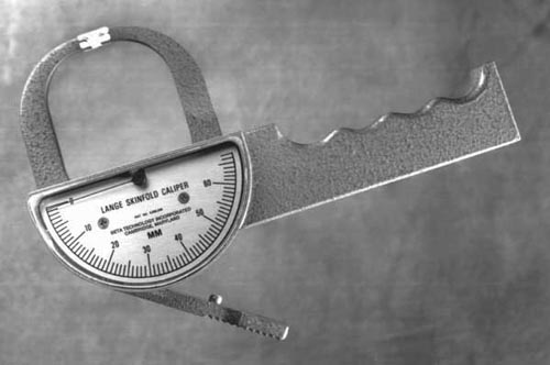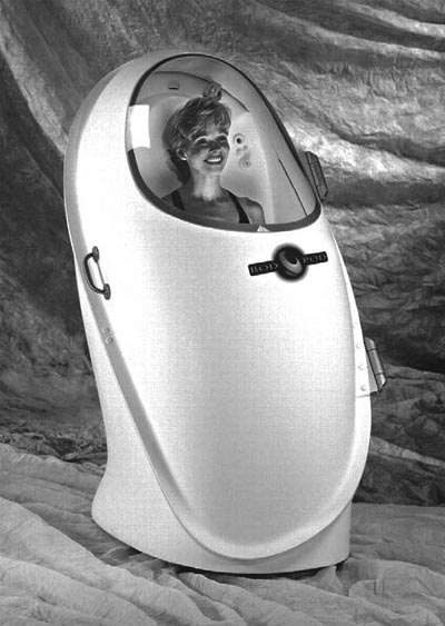 Рис. 4. Калипер Ланге (Beta Technology, США) Несущественный жир состоит из подкожного и внутреннего жира. Подкожный жир распределен относительно равномерно вдоль поверхности тела. Внутренний (висцеральный) жир сосредоточен главным образом в брюшной полости. Установлено, что риск развития сердечно сосудистых и других заболеваний, связанных с избыточной массой тела, выше при содержании внутреннего, а не подкожного жира [29]. Иногда используется понятие абдоминального жира, под которым понимается совокупность внутреннего и под кожного жира, локализованных в области живота. Масса тела, свободного от жира, т.е. липидов, имеет название безжировой массы тела (БМТ). БМТ состоит из воды, мышечной массы, массы скелета и других составляющих. Эталонные методы изучения состава тела в двух компонентной модели базируются на оценке плотности тела. К ним относятся гидростатическая денситометрия и воздушная плетизмография. Метод гидростатической денситометрии (ГД) заключается в измерении веса тела в воде и в обычных условиях, а так же остаточного объема легких с последующей оценкой плотности тела (ПТ) по формуле: ПТ = Вт / [(Вт - Втв) / Пв - (ООЛ - 0,1)], где Вт - обычный вес тела, Втв - вес тела в воде, Пв - плотность воды, а ООЛ - остаточный объем легких [11]. Процентное содержание жира (%ЖМТ) вычисляется по формулам, специфичным для пола и возраста (табл. 1). Погрешность оценки жировой массы при повторных измерениях, выполненных одним и тем же специалистом, составляет 2,5%. Неудобство метода ГД связано с большой длительностью процедуры измерений (до 1 ч) и необходимостью полного погружения в воду, что значительно снижает возможности применения метода у детей, а также у пожилых и больных людей. Указанных недостатков лишен недавно предложенный метод воздушной плетизмографии (ВП) [15]. Измерения проводят в герметичной кабине, заполненной обычным воздухом (рис. 5). Устройство разработано компанией Life Measurement Instruments (США) в 1994 г. Воспроизводимость результатов измерений по сравнению с ГД более высокая, а стандартная ошибка оценки %ЖМТ составляет около 0,3% [33]. Процедура измерений занимает 5 - 7 мин. Основная погрешность методов ГД и ВП связана с предположением о постоянстве плотности БМТ у разных индивидов. Для повышения точности их иногда используют в сочетании с другими методами, дающими дополнительную информацию о состоянии белкового, водного и/или минерального обмена.